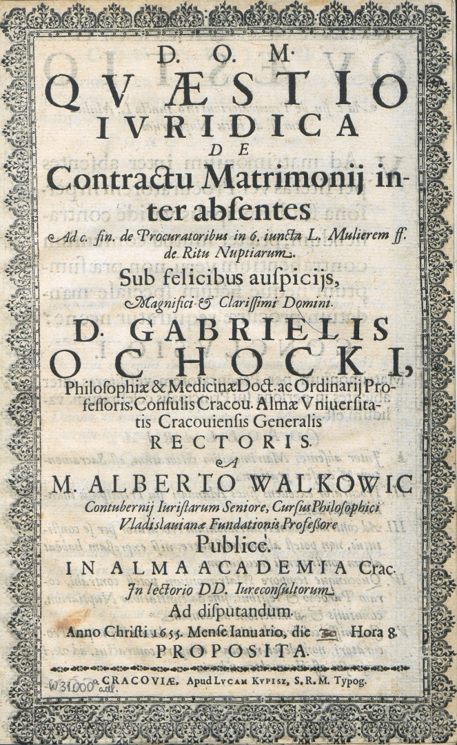 "Qvaestio ivridica de contractu matrimonij inter absentes [...] sub [...] auspicijs [...] Gabrielis Ochocki [...] rectoris" Wojciecha Wałkowica., [online] Warszawa: Narodowy Instytut Audiowizualny [dostęp 05.03.2026]. Dostępny w internecie: http://www.ipsb.nina.gov.pl/a/foto/qvaestio-ivridica-de-contractu-matrimonij-inter-absentes-sub-auspicijs-gabrielis-ochocki-rectoris-wojciecha-walkowica