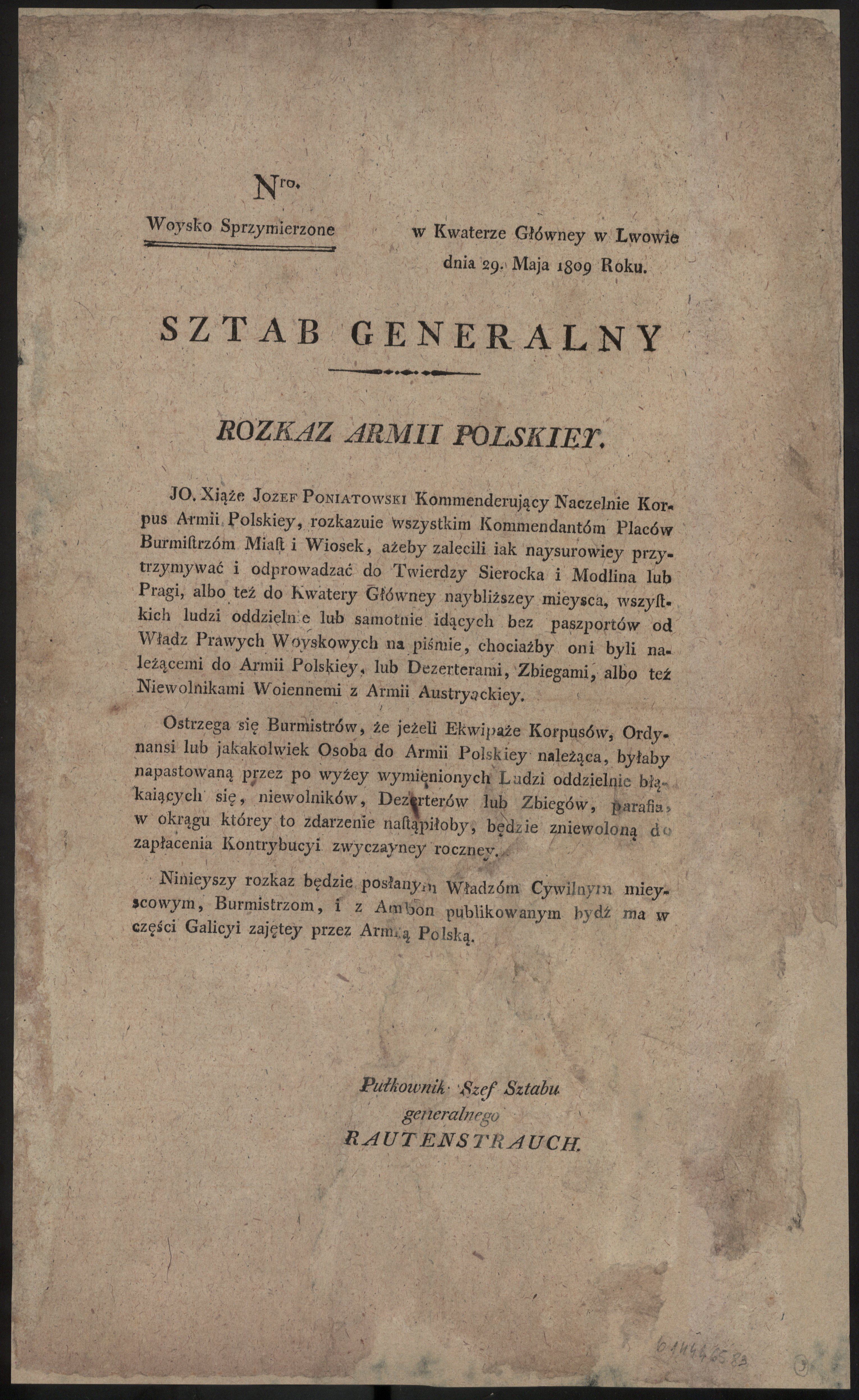Rozkaz podpisany przez Józefa  Rautenstraucha w Kwaterze Głównej Sztabu Generalnego we Lwowie w 1809 roku w czasie wojny polsko-austriackiej.