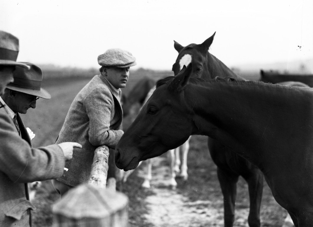 Konie na pastwisku. Widoczny m.in. książę Roman Sanguszko (w jasnym garniturze i kaszkiecie, oparty o ogrodzenie pastwiska).