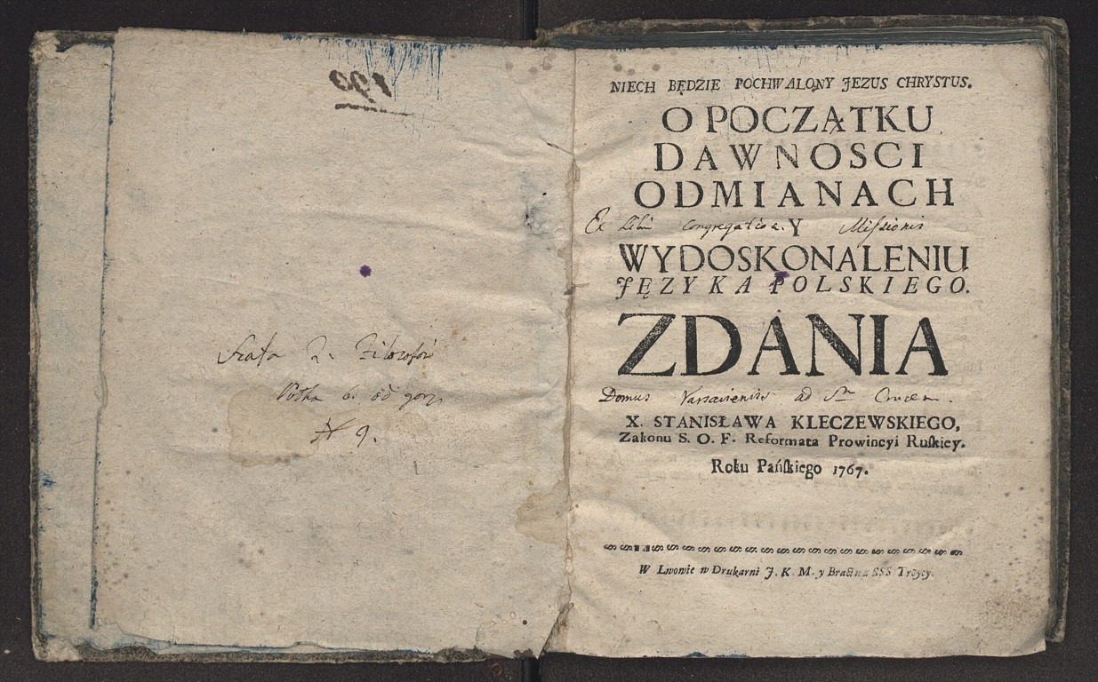 Stanisław Dominik Kleczewski, "O początku, dawnosci, odmianach y wydoskonaleniu jezyka ..." (strona tytułowa), [online] Warszawa: Narodowy Instytut Audiowizualny [dostęp 02.04.2026]. Dostępny w internecie: http://www.ipsb.nina.gov.pl/a/foto/stanislaw-dominik-kleczewski-o-poczatku-dawnosci-odmianach-y-wydoskonaleniu-jezyka-polskiego-zdania-x-stanislawa-kleczewskiego-strona-tytulowa