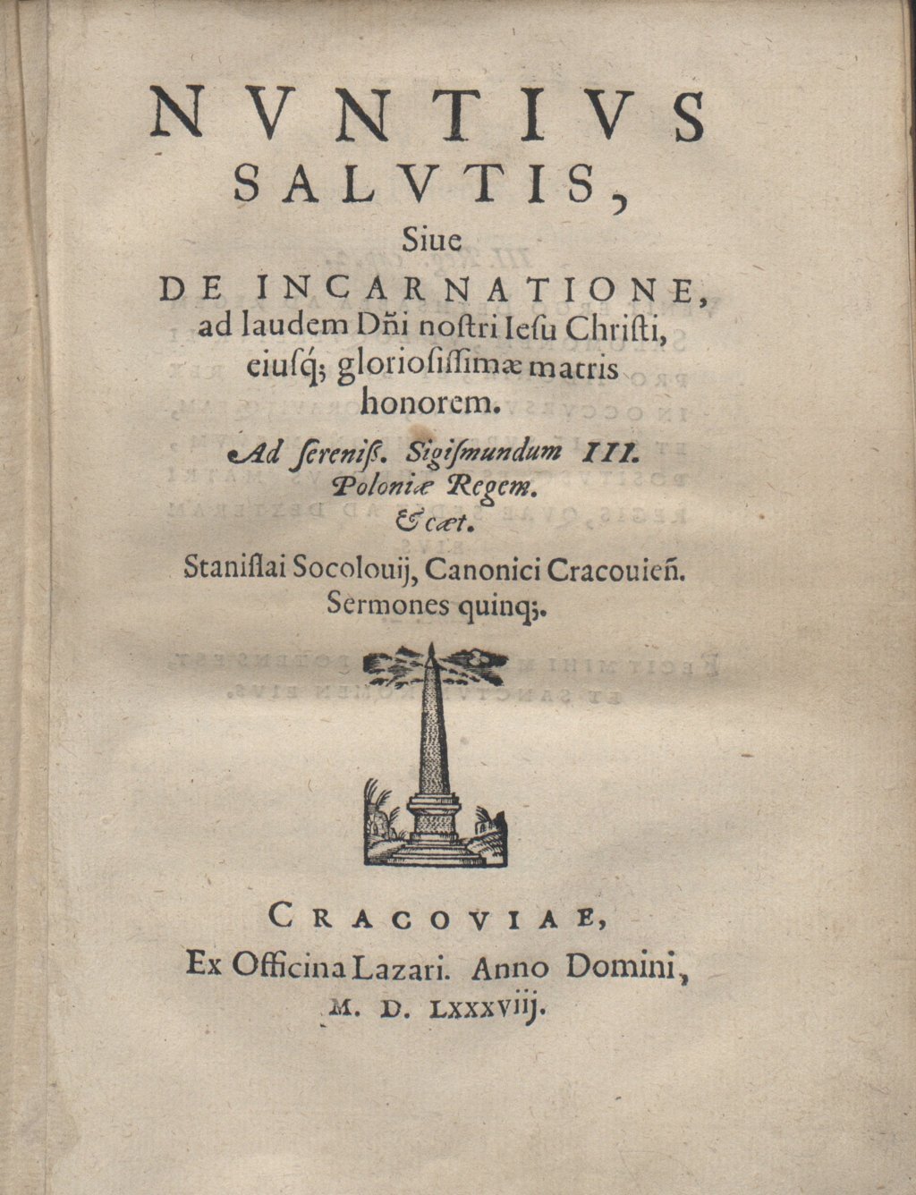 Stanisław Sokołowski "Nuntius salutis, sive de Incarnatione, ad laudem Divini nostri Iesu Christi [...] Stanislai Socolouij [...] sermones quinque." (strona tytułowa), [online] Warszawa: Narodowy Instytut Audiowizualny [dostęp 01.04.2026]. Dostępny w internecie: http://www.ipsb.nina.gov.pl/a/foto/stanislaw-sokolowski-nuntius-salutis-sive-de-incarnatione-ad-laudem-divini-nostri-iesu-christi-stanislai-socolouij-sermones-quinque-strona-tytulowa
