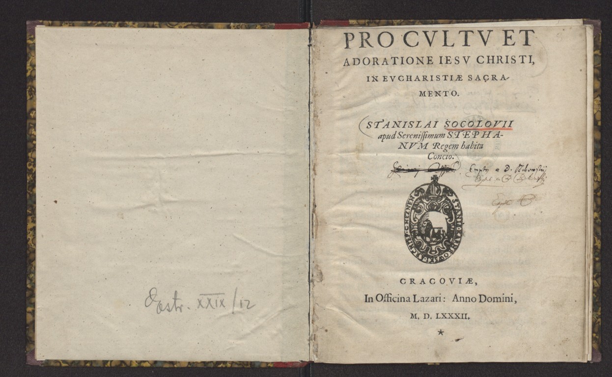 Stanisław Sokołowski "Pro cvltv et adoratione Iesv Christi in Evcharistiae sacramento Stanislai Socolovii" (strona tytułowa), [online] Warszawa: Narodowy Instytut Audiowizualny [dostęp 01.04.2026]. Dostępny w internecie: http://www.ipsb.nina.gov.pl/a/foto/stanislaw-sokolowski-pro-cvltv-et-adoratione-iesv-christi-in-evcharistiae-sacramento-stanislai-socolovii-strona-tytulowa