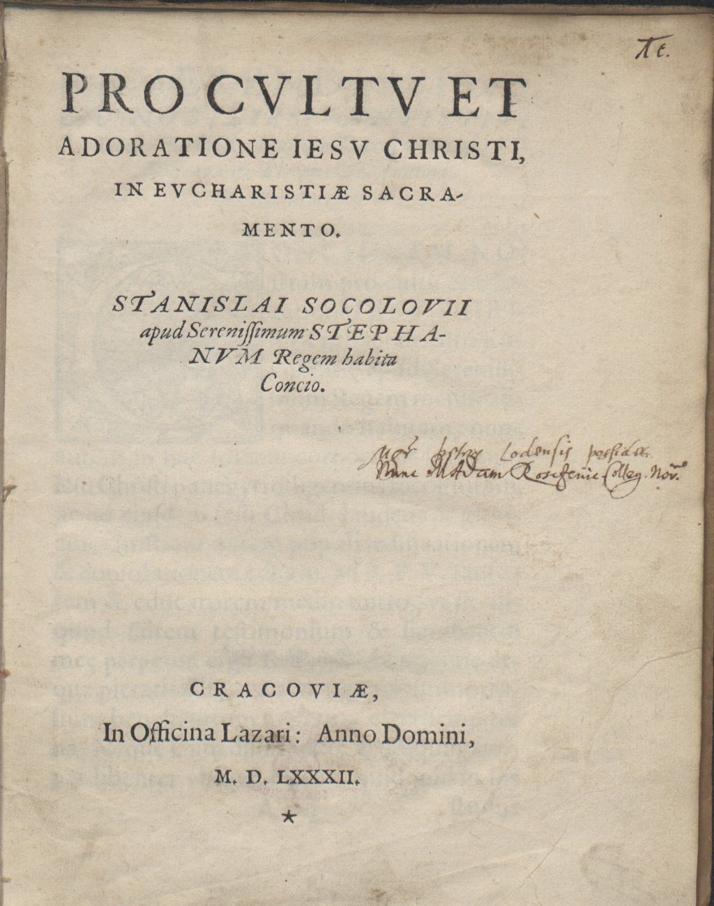, Stanisław Sokołowski "Pro cvltv et adoratione Iesv Christi in Evcharistiae sacramento Stanislai[i] Socolovii [...]." (strona tytułowa), [w:] Polski słownik biograficzny, t. ,