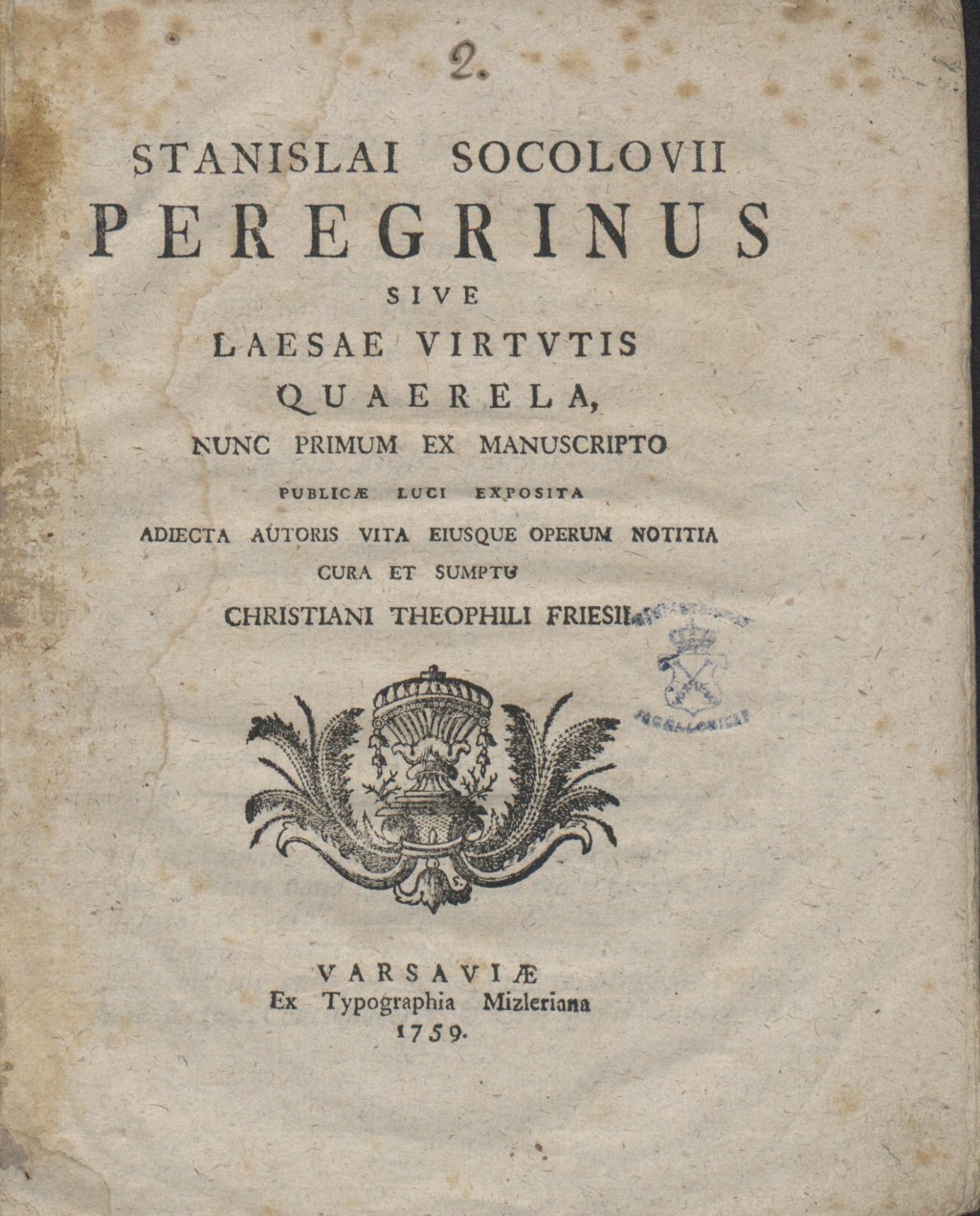 Stanisław Sokołowski "Stanislai Socolovii Peregrinus sive laesae virtutis quaerela, nunc primum ex manuscripto publicae luci exposita, adiecta autoris vita eiusque operum notitia." (strona tytułowa), [online] Warszawa: Narodowy Instytut Audiowizualny [dostęp 01.04.2026]. Dostępny w internecie: http://www.ipsb.nina.gov.pl/a/foto/stanislaw-sokolowski-stanislai-socolovii-peregrinus-sive-laesae-virtutis-quaerela-nunc-primum-ex-manuscripto-publicae-luci-exposita-adiecta-autoris-vita-eiusque-operum-notitia-strona-tytulowa