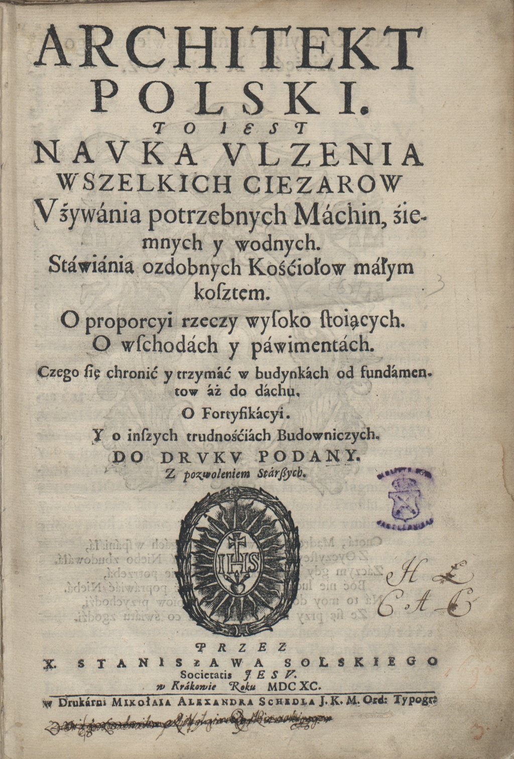 Stanisław Solski "Architekt polski : to jest nauka ulzenia wszelkich ciezarow, uzywania potrzebnych machin, ziemnych y wodnych, stawiania ozdobnych Kościołow małym kosztem [...], o fortyfikacyi y o inszych trudnościach budowniczych / do druku podany przez Stanisława Solskiego." (strona tytułowa)