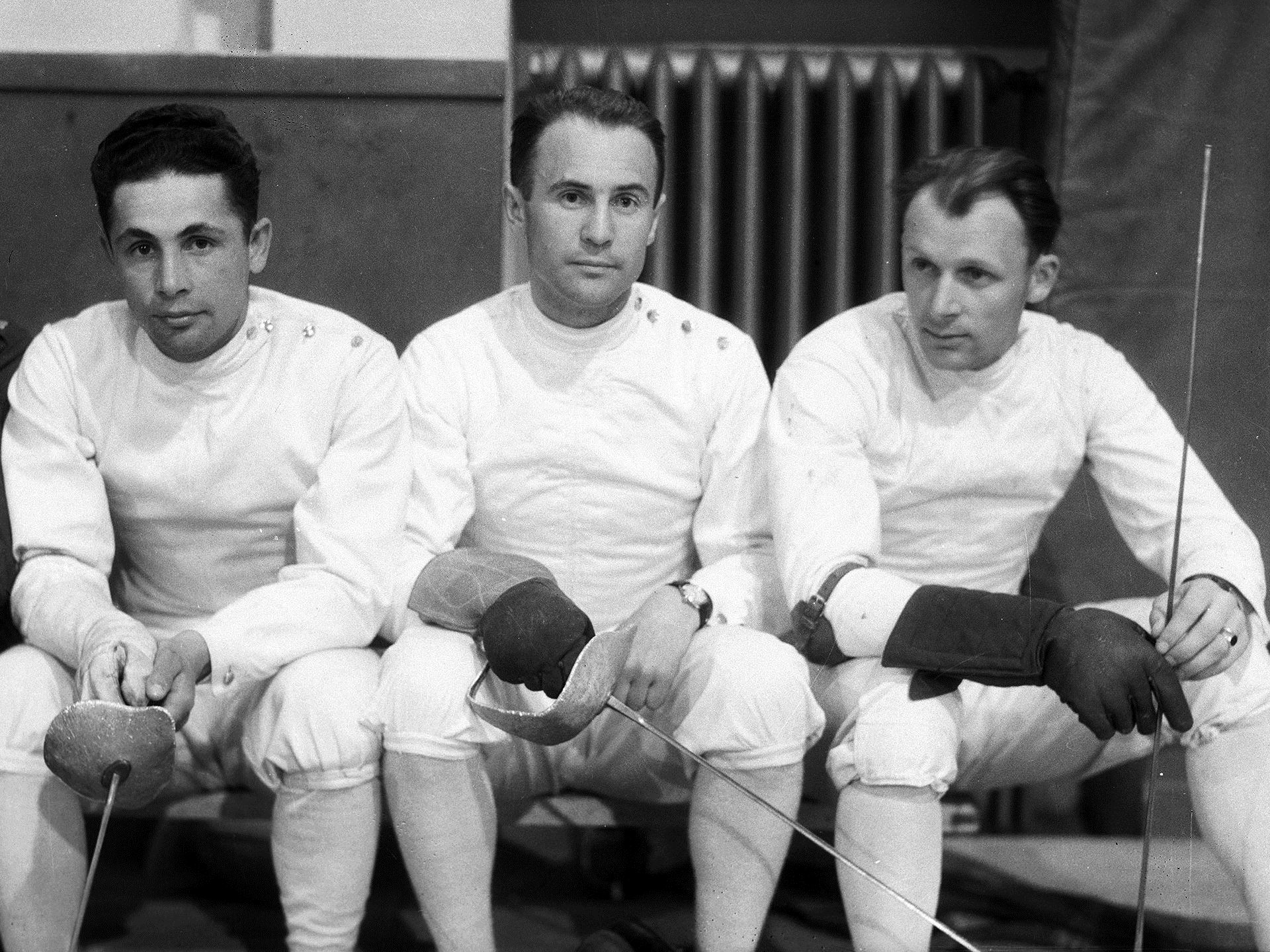 Fotografia grupowa zwycięzców poszczególnych konkurencji. Siedzą od lewej: zdobywca drugiego miejsca w szabli I klasy oficerskiej, por. Emil Tichy, mistrz w szpadzie I klasy oficerskiej, por. Kazimierz Laskowski oraz zdobywca I miejsca w szabli I klasy, por. Wincenty Fryszczyn.
