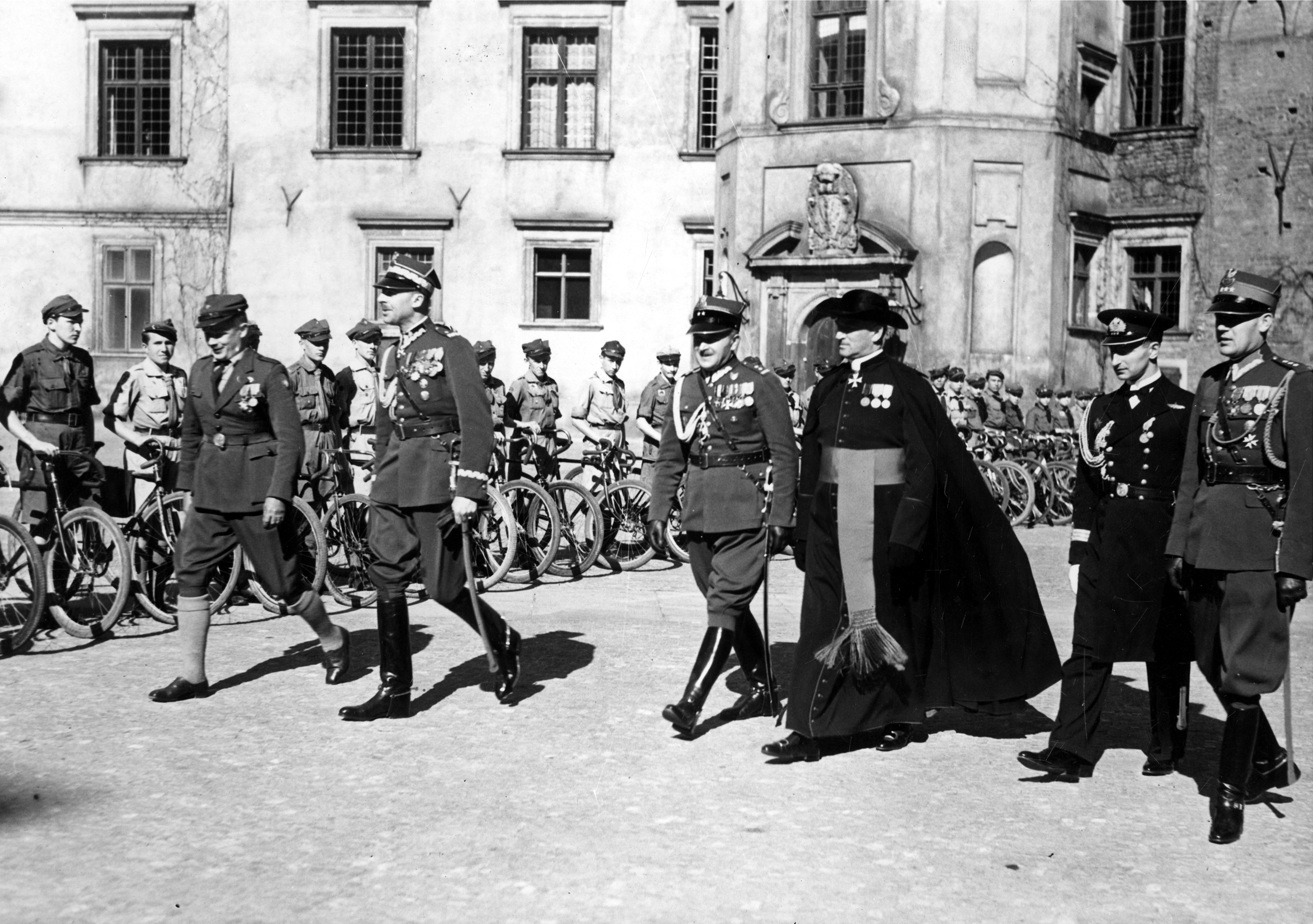 Widoczni m.in.: generał Kazimierz Schally (2. z lewej), zastępca Szefa Gabinetu Wojskowego ppłk Stefan Czerwiński (3. z lewej), kapelan prezydenta RP ks. prałat Jan Humpola (4. z lewej), adiutant prezydenta RP kapitan Stefan Kryński (2. z prawej), dowódca Zamkowego Plutonu Żandarmerii kpt. Jan Huber (1. z prawej).