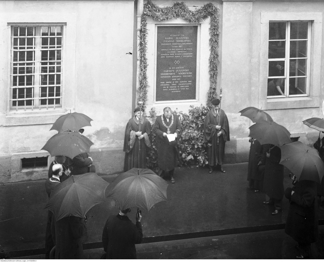 Tablica pamiątkowa ku czci profesorów Karola Olszewskiego i Zygmunta Wróblewskiego wmurowana w ścianę jednego z budynków Uniwersytetu Jagiellońskiego w Krakowie w 1938 roku., [online] Warszawa: Narodowy Instytut Audiowizualny [dostęp 13.04.2026]. Dostępny w internecie: http://www.ipsb.nina.gov.pl/a/foto/tablica-pamiatkowa-ku-czci-profesorow-karola-olszewskiego-i-zygmunta-wroblewskiego-wmurowana-w-sciane-jednego-z-budynkow-uniwersytetu-jagiellonskiego-w-krakowie-w-1938-roku