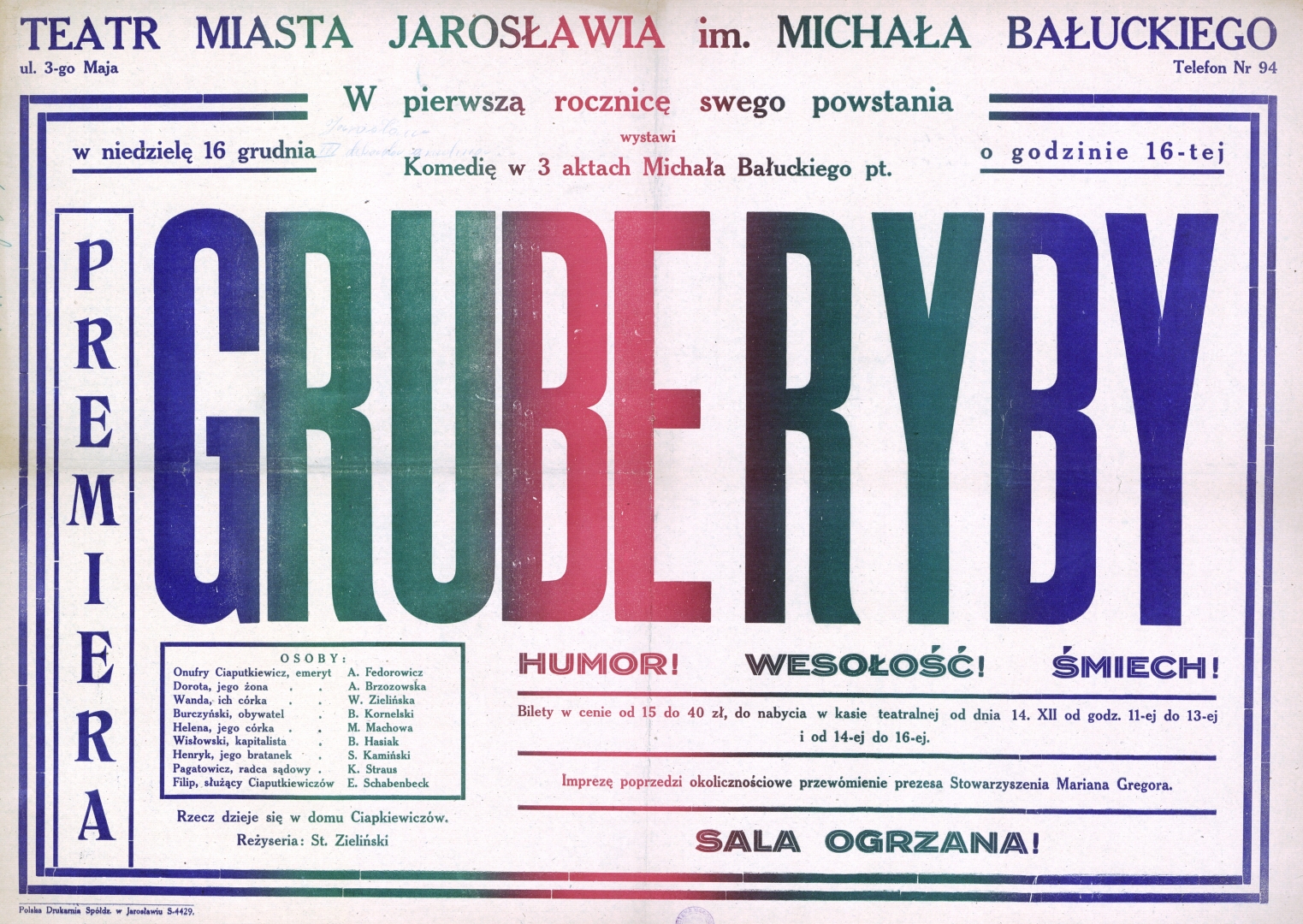 Teatr Miasta Jarosławia im. M. Bałuckiego w niedzielę 16 grudnia w pierwszą rocznicę swego powstania wystawi komedię w 3 aktach Michała Bałuckiego pt. "Grube ryby" [...]., [online] Warszawa: Narodowy Instytut Audiowizualny [dostęp 13.04.2026]. Dostępny w internecie: http://www.ipsb.nina.gov.pl/a/foto/teatr-miasta-jaroslawia-im-m-baluckiego-w-niedziele-16-grudnia-w-pierwsza-rocznice-swego-powstania-wystawi-komedie-w-3-aktach-michala-baluckiego-pt-grube-ryby