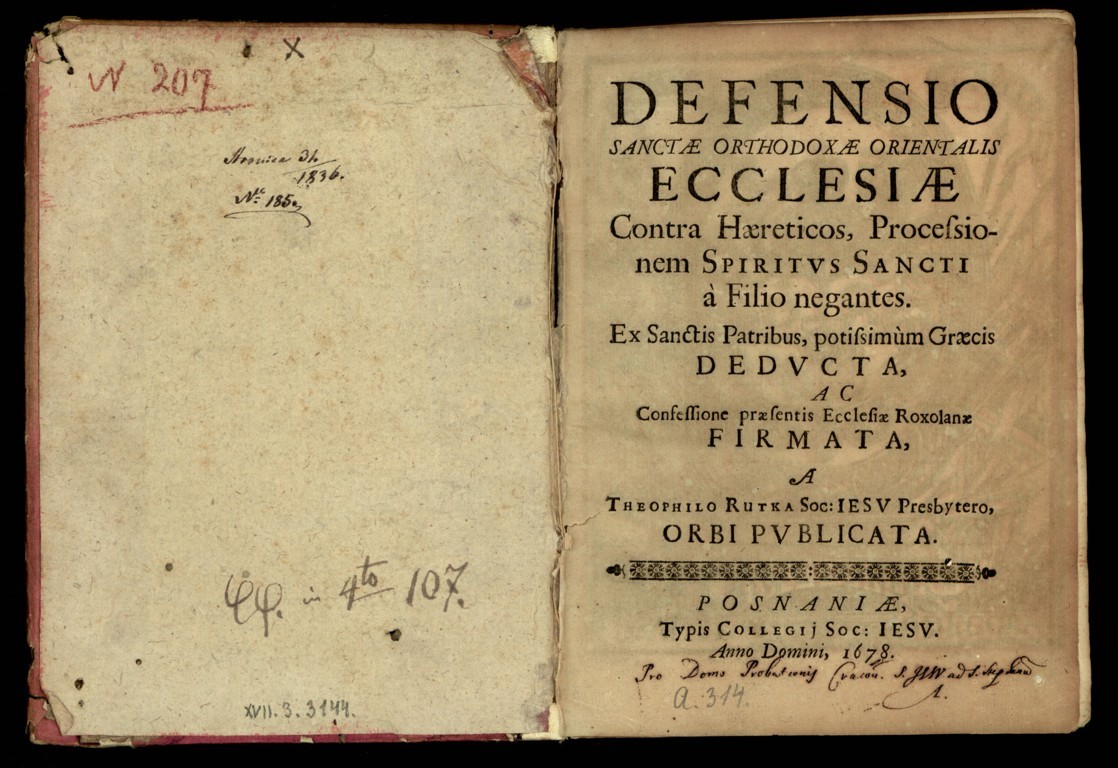 Teofil Rutka "Defensio Sanctae Orthodoxae Orientalis Ecclesiae contra haereticos processionem Spiritvs Sancti a Filio negantes, ex sanctis patribus potissimum Graecis dedvcta ac confessione praesentis Ecclessiae Roxolanae firmata, a Theophilo Rutka [...], [online] Warszawa: Narodowy Instytut Audiowizualny [dostęp 10.03.2026]. Dostępny w internecie: http://www.ipsb.nina.gov.pl/a/foto/teofil-rutka-defensio-sanctae-orthodoxae-orientalis-ecclesiae-contra-haereticos-processionem-spiritvs-sancti-a-filio-negantes-ex-sanctis-patribus-potissimum-graecis-dedvcta-ac-confessione-praesentis-ecclessiae-roxolanae-firmata-a-theophilo-rutka-pvbl
