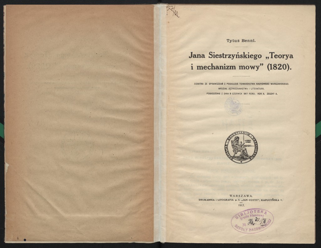 Tytus Benni "Jana Siestrzyńskiego "Teorya i mechanizm mowy" " (strona tytułowa), [online] Warszawa: Narodowy Instytut Audiowizualny [dostęp 13.04.2026]. Dostępny w internecie: http://www.ipsb.nina.gov.pl/a/foto/tytus-benni-jana-siestrzynskiego-teorya-i-mechanizm-mowy-strona-tytulowa