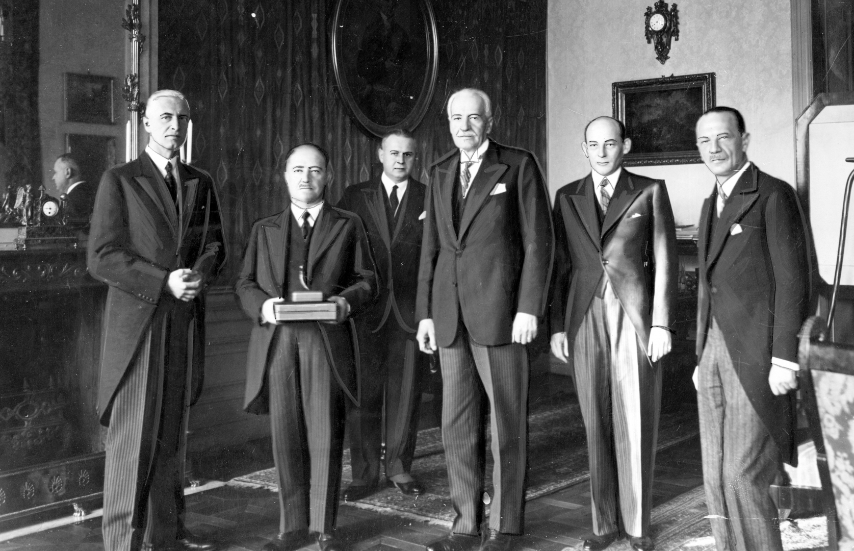 Widoczni od lewej: marszałek Senatu Władysław Raczkiewicz, prezes Najwyższej Izby Kontroli Jakub Krzemieński, szef Kancelarii Cywilnej prezydenta RP Bronisław Hełczyński, prezydent RP Ignacy Mościcki, premier Janusz Jędrzejewicz, marszałek Sejmu Kazimierz Świtalski.