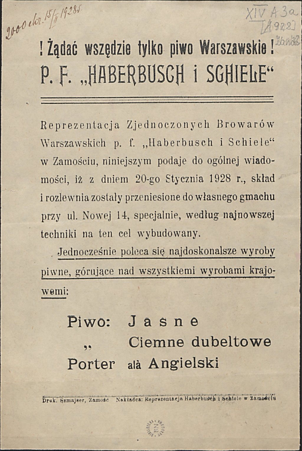 , Ulotka promocyjna browaru Haberbusch i Schiele (1928 r.), [w:] Polski słownik biograficzny, t. ,