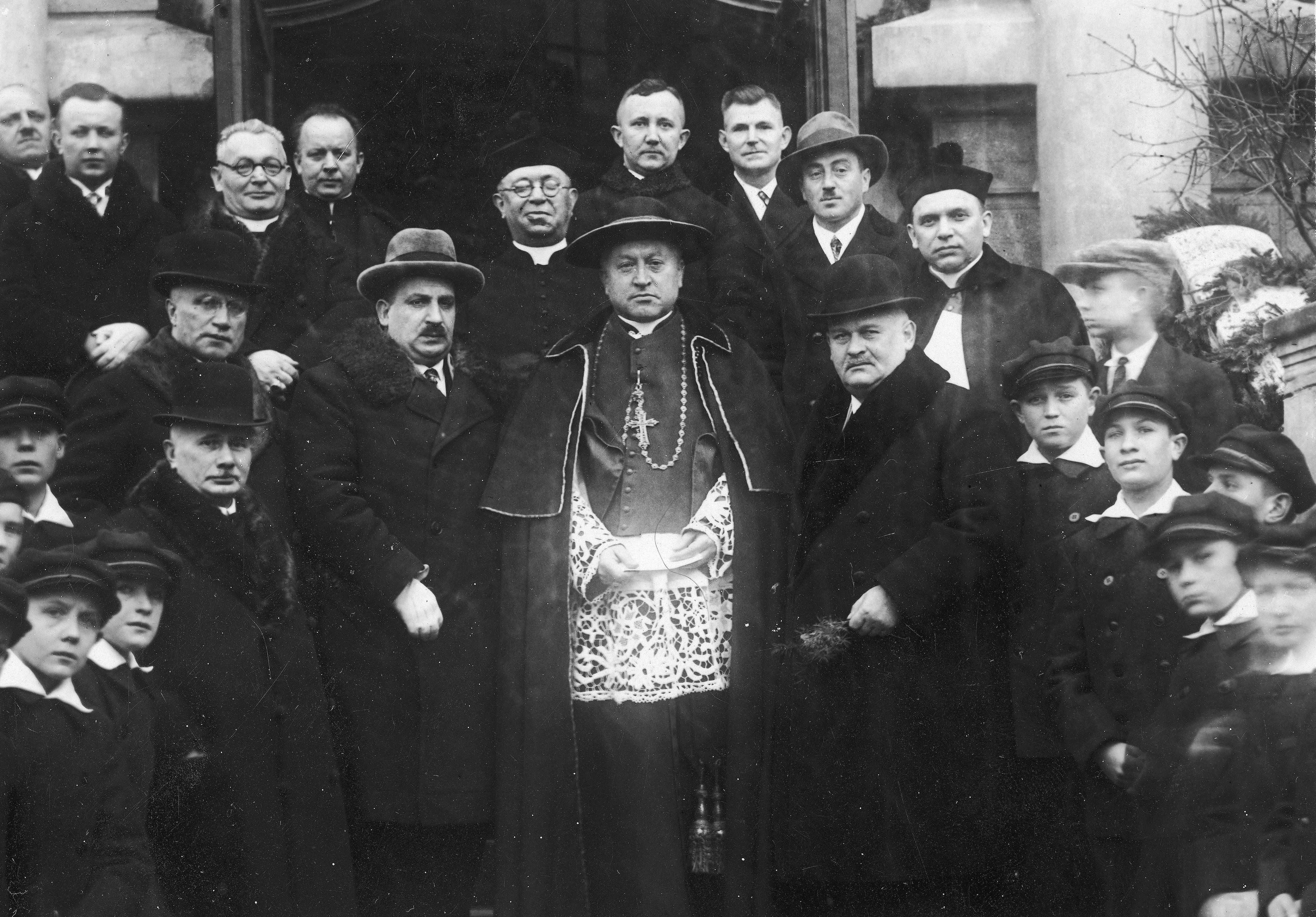 Widoczni m.in.: kardynał August Hlond (I rząd 2. z prawej), prezydent Poznania Cyryl Ratajski (I rząd 1. z prawej), naczelnik Wydziału Samorządowego Urzędu Wojewódzkiego w Poznaniu Aleksander Trzciński (I rząd 3. z prawej), starosta krajowy poznański Ludwik Begale (stoi obok A. Trzcińskiego), ksiądz Nikodem Mędlewski (stoi na prawo za C. Ratajskim).