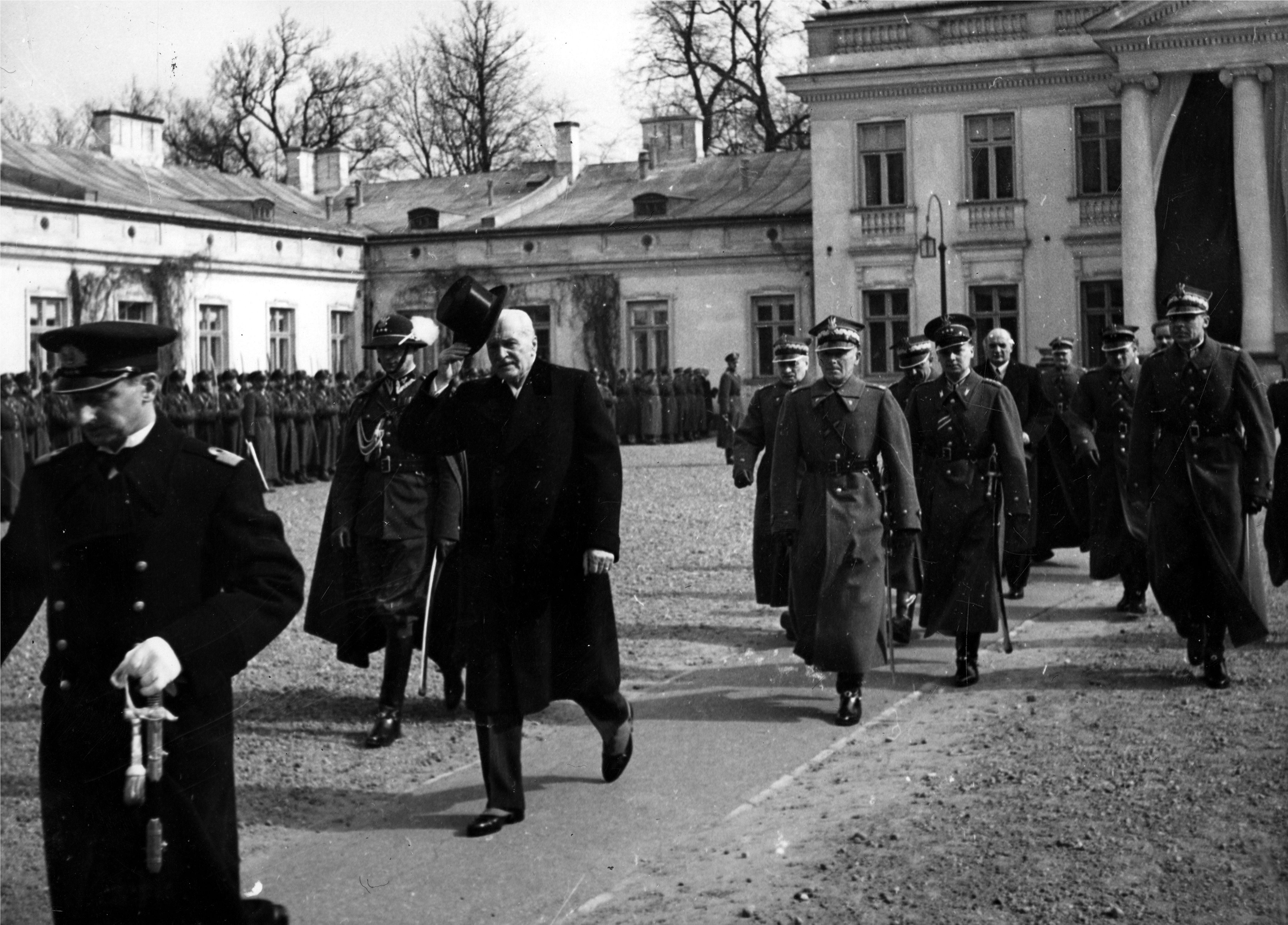 Prezydent Ignacy Mościcki (z cylindrem w dłoni) wraz z marszałkiem Edwardem Śmigłym-Rydzem (na chodniku, pierwszy za prezydentem) opuszczają Belweder po złożeniu wieńca. Widoczni także m.in.: adiutanci prezydenta Mościckiego kapitan Marynarki Wojennej RP Stefan Kryński (na pierwszym planie z lewej), kapitan Strzelców Podhalańskich Józef Hartman (na lewo za prezydentem), adiutant marszałka Śmigłego-Rydza rtm. Edward Mańkowski (na prawo za marszałkiem), gen. Felicjan Sławoj Składkowski (na lewo za marszałkiem Śmigłym-Rydzem) i szef Protokołu Dyplomatycznego Ministerstwa Spraw Zagranicznych Karol Romer (w głębi, za rtm. E. Mańkowskim).