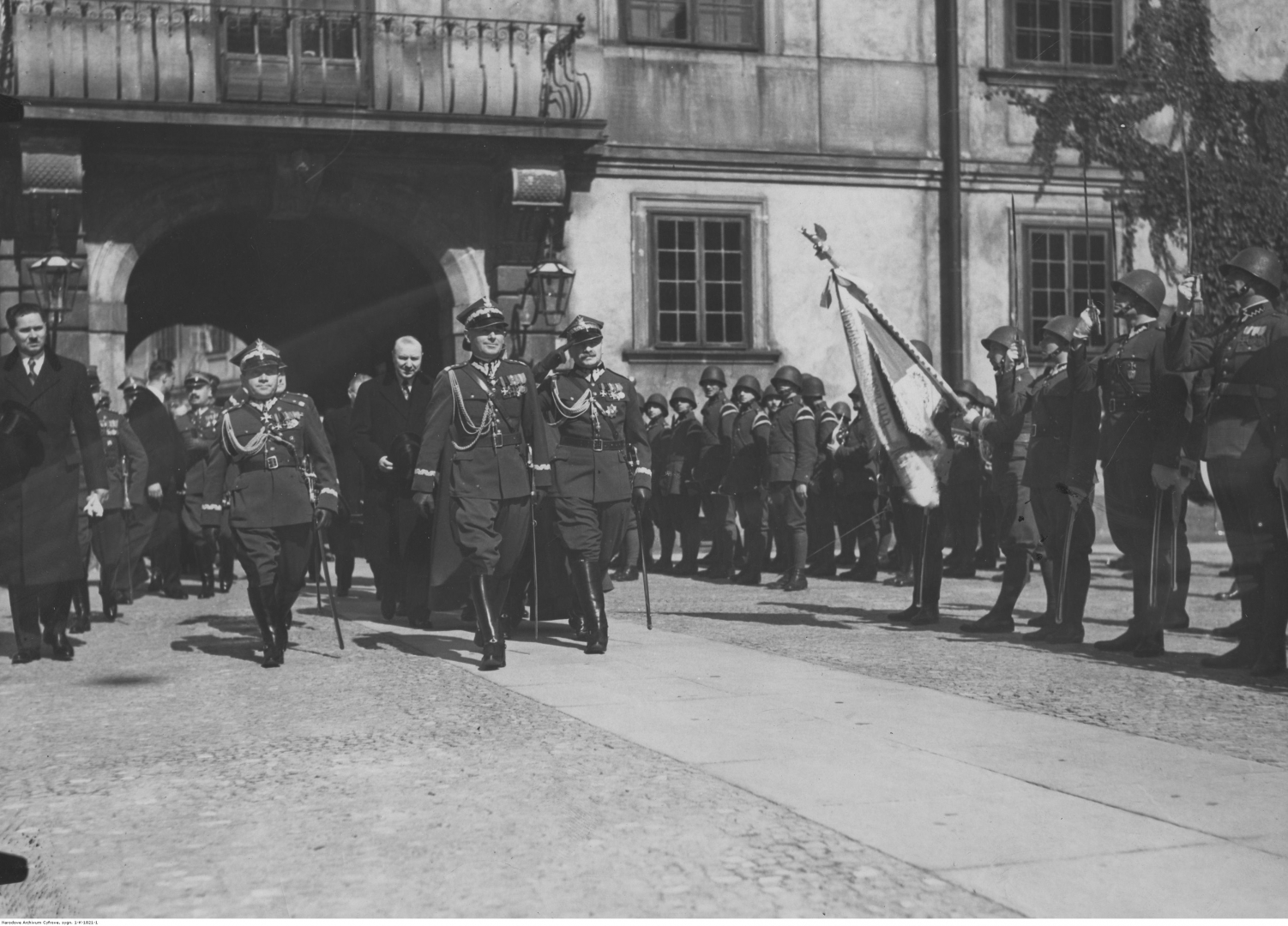 Nabożeństwo na placu Zamkowym. Generał Edward Śmigły-Rydz (z przodu) w towarzystwie premiera Felicjana Sławoja Składkowskiego (pierwszy z prawej), generała Mieczysława Rysia-Trojanowskiego, marszałka Stanisława Cara (z tyłu z kapeluszem w ręku) i wicekomisarza Rządu na miasto stołeczne Warszawę Kazimierza Jurgielewicza przybywa na mszę.