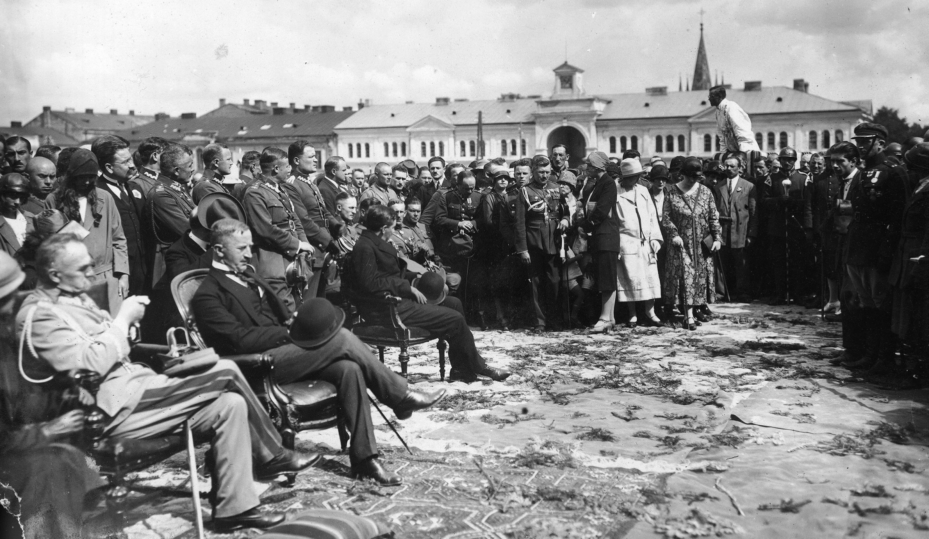 Marszałek Józef Piłsudski z żoną Aleksandrą (na lewo od marszałka) wraz z innymi uczestnikami uroczystości. Widoczny także m.in. wojewoda kielecki Ignacy Manteuffel (siedzi na prawo od marszałka).