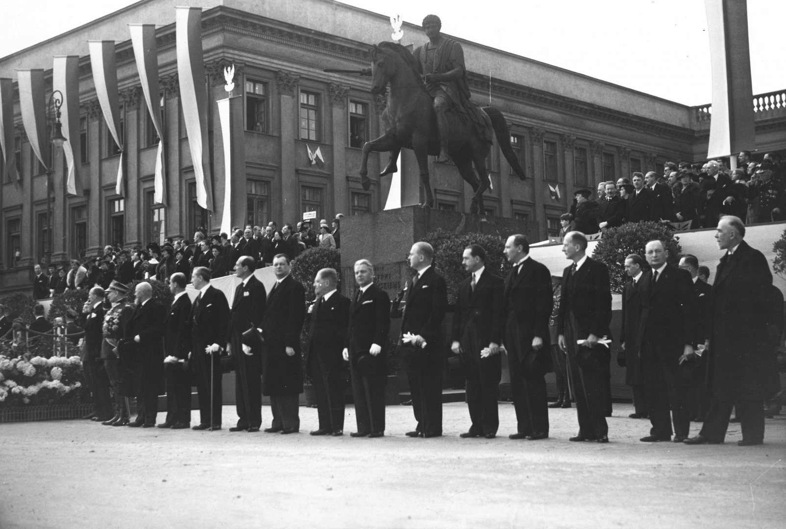 Członkowie rządu stoją w rzędzie podczas rewii wojskowej na placu Piłsudskiego. Widoczni m.in. premier i minister spraw wewnętrznych gen. Felicjan Sławoj Składkowski (w mundurze), wicepremier i minister skarbu Eugeniusz Kwiatkowski (3. na prawo od Składkowskiego), minister spraw zagranicznych Józef Beck (4. na prawo od Składkowskiego), minister komunikacji Juliusz Ulrych (7. z prawej, jasne włosy), wiceminister komunikacji Julian Piasecki (5. z prawej). W tle pomnik ks. Józefa Poniatowskiego i fasada Pałacu Saskiego.