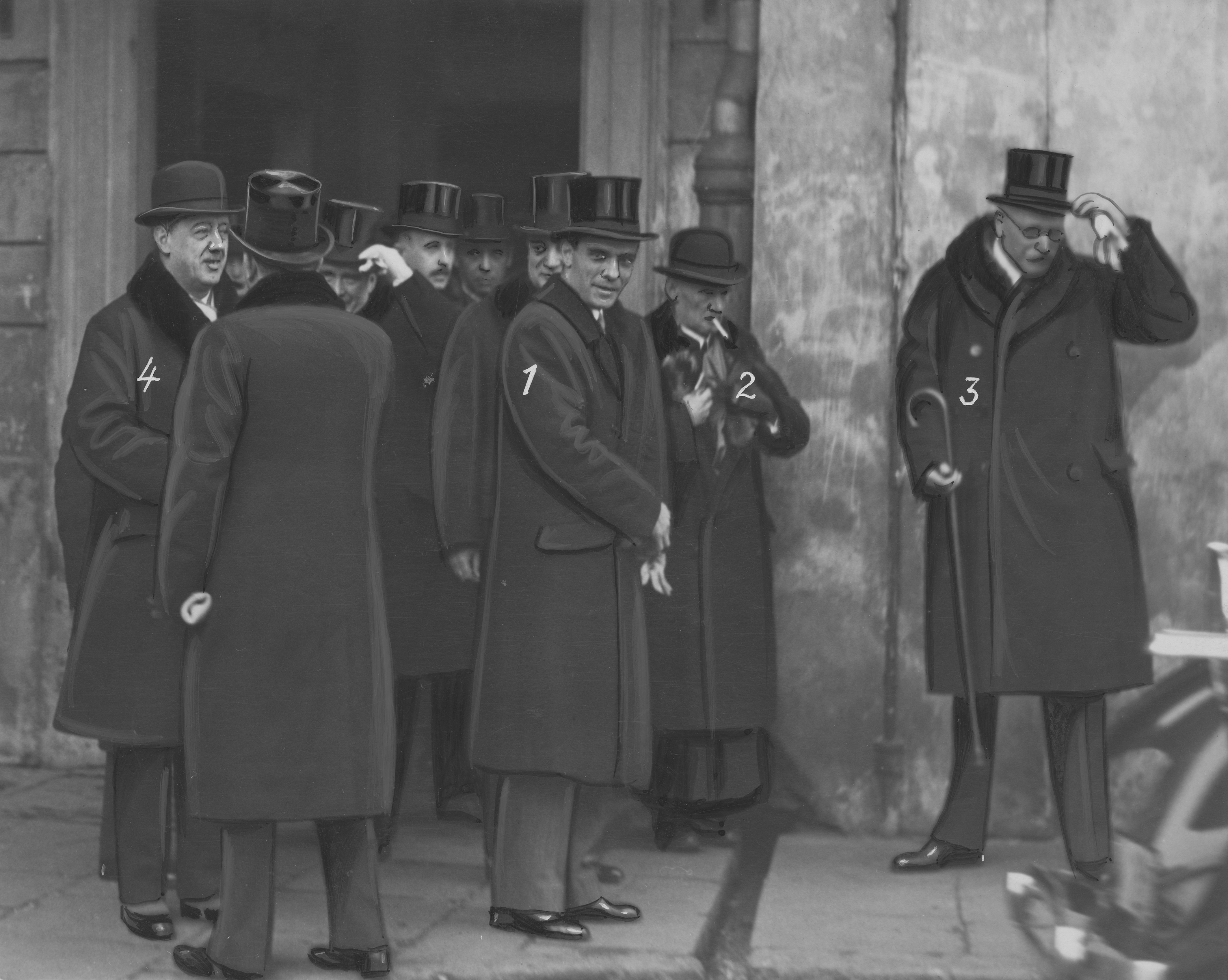 Grupa uczestników nabożeństwa wychodzących z katedry św. Jana. Widoczni mi.in: ambasador Włoch w Polscie Giuseppe Bastianini (1), wiceminister Wyznań Religijnych i Oświecenia Publicznego Bronisław Żongołłowicz (2), dyrektor Departamentu Wyznań w Ministerstwie Wyznań Religijnych hr. Franciszek Salezy Potocki (3), prezydent Warszawy Zygmunt Słomiński (4).