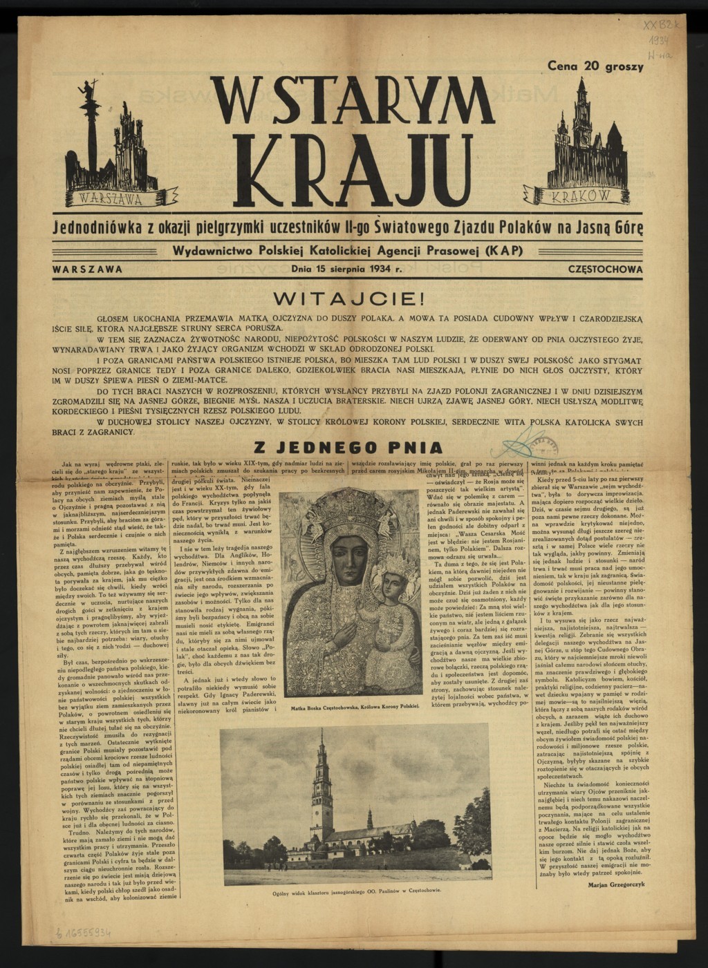 "W starym kraju: jednodniówka z okazji pielgrzymki uczestników II-go Światowego Zjazdu Polaków na Jasną Górę" (1935 r.) (red. Leon Radziejowski), [online] Warszawa: Narodowy Instytut Audiowizualny [dostęp 14.04.2026]. Dostępny w internecie: http://www.ipsb.nina.gov.pl/a/foto/w-starym-kraju-jednodniowka-z-okazji-pielgrzymki-uczestnikow-ii-go-swiatowego-zjazdu-polakow-na-jasna-gore-1935-r-red-leon-radziejowski