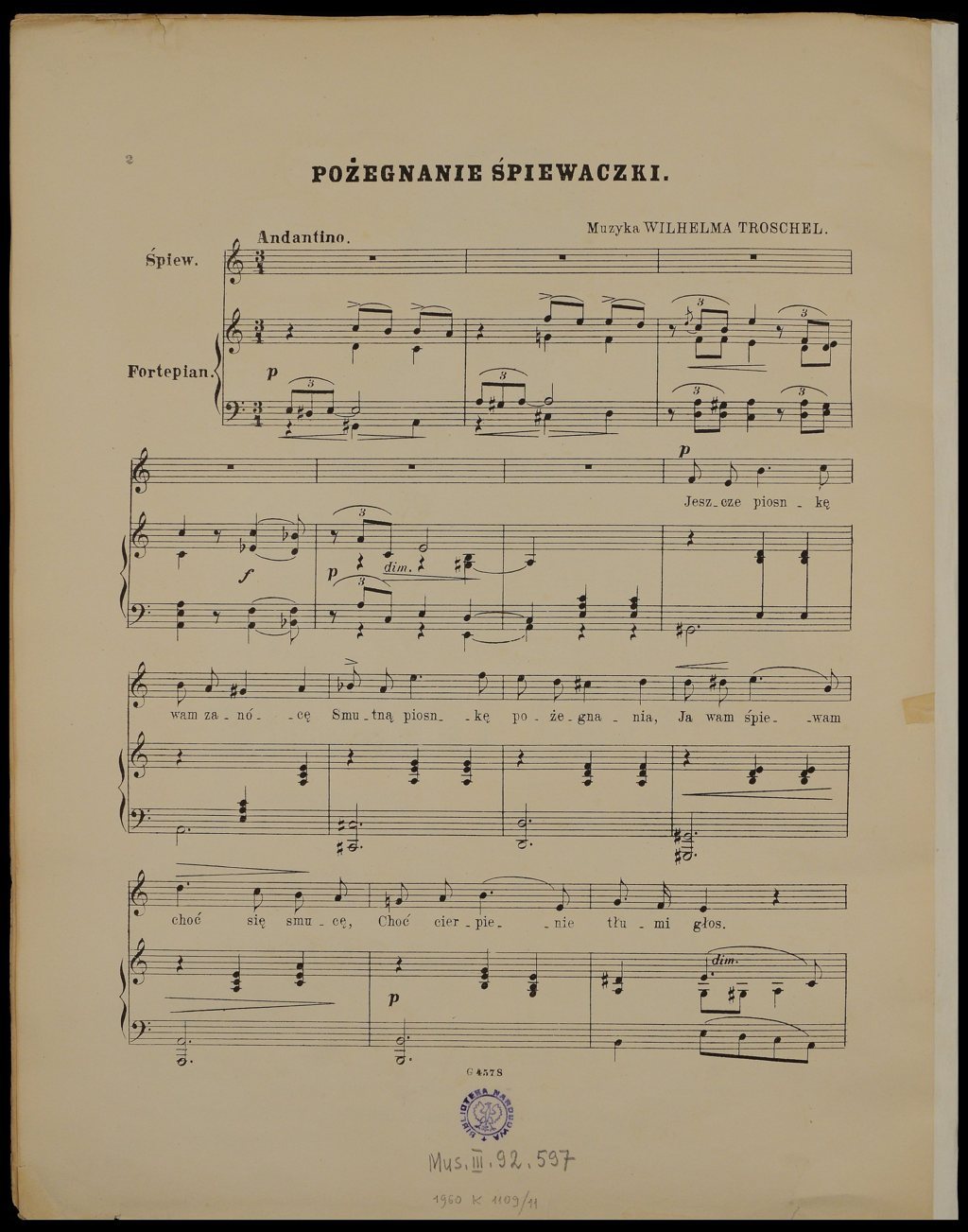 , Wilhelm Troschel "Pożegnanie śpiewaczki" (partytura, wyd. Gustaw Sennewald), [w:] Polski słownik biograficzny, t. ,