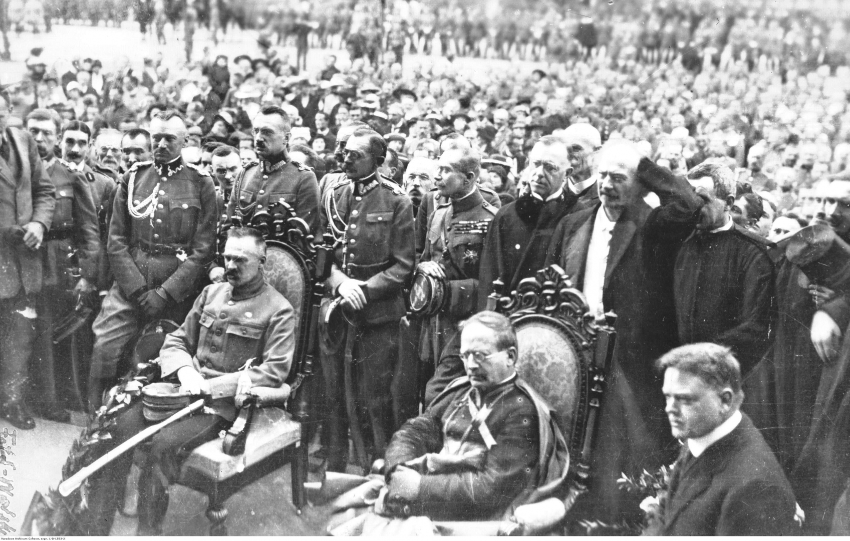 Nierozpoznana uroczystość z udziałem szefa misji pomocy dla ofiar I wojny światowej Herberta Hoovera (siedzi pierwszy z prawej), Naczelnika Państwa Józefa Piłsudskiego (siedzi pierwszy z lewej), nuncjusza papieskiego Achillesa Ratti (siedzi w środku), premiera Ignacego Jana Paderewskiego (stoi za nuncjuszem papieskim) i oficerów Wojska Polskiego