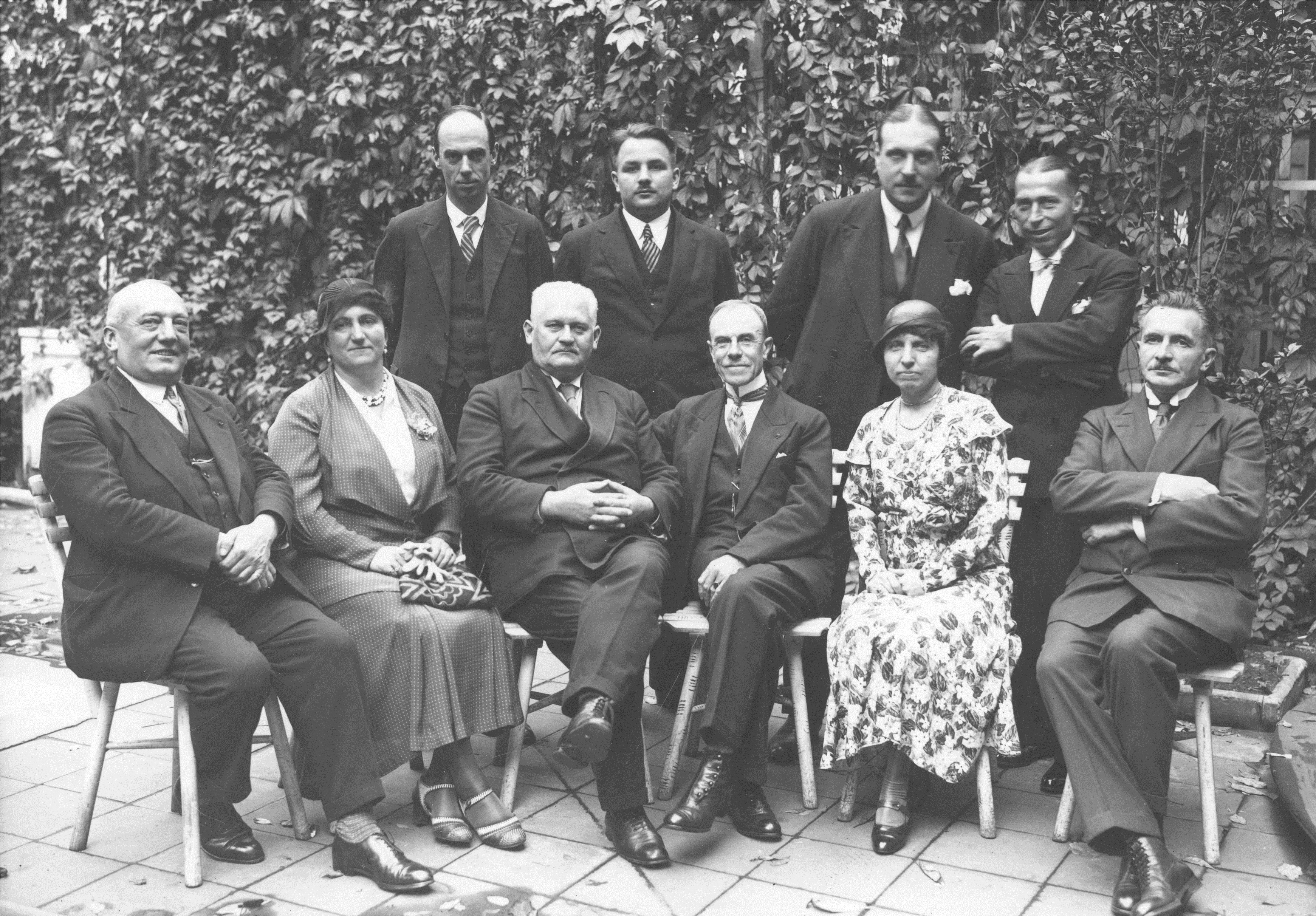 Pobyt delegacji radnych Paryża w Poznaniu. Widoczni m.in. wiceprezydent Paryża Quentin (siedzi, czwarty z lewej), radca L`Henrys (siedzi, pierwszy z lewej), radca Brunessaux (stoi, drugi z prawej), prezydent Poznania Cyryl Ratajski (siedzi, trzeci z lewej), prezes Rady Miejskiej m. Poznania Romuald Paczkowski (siedzi, pierwszy z prawej).