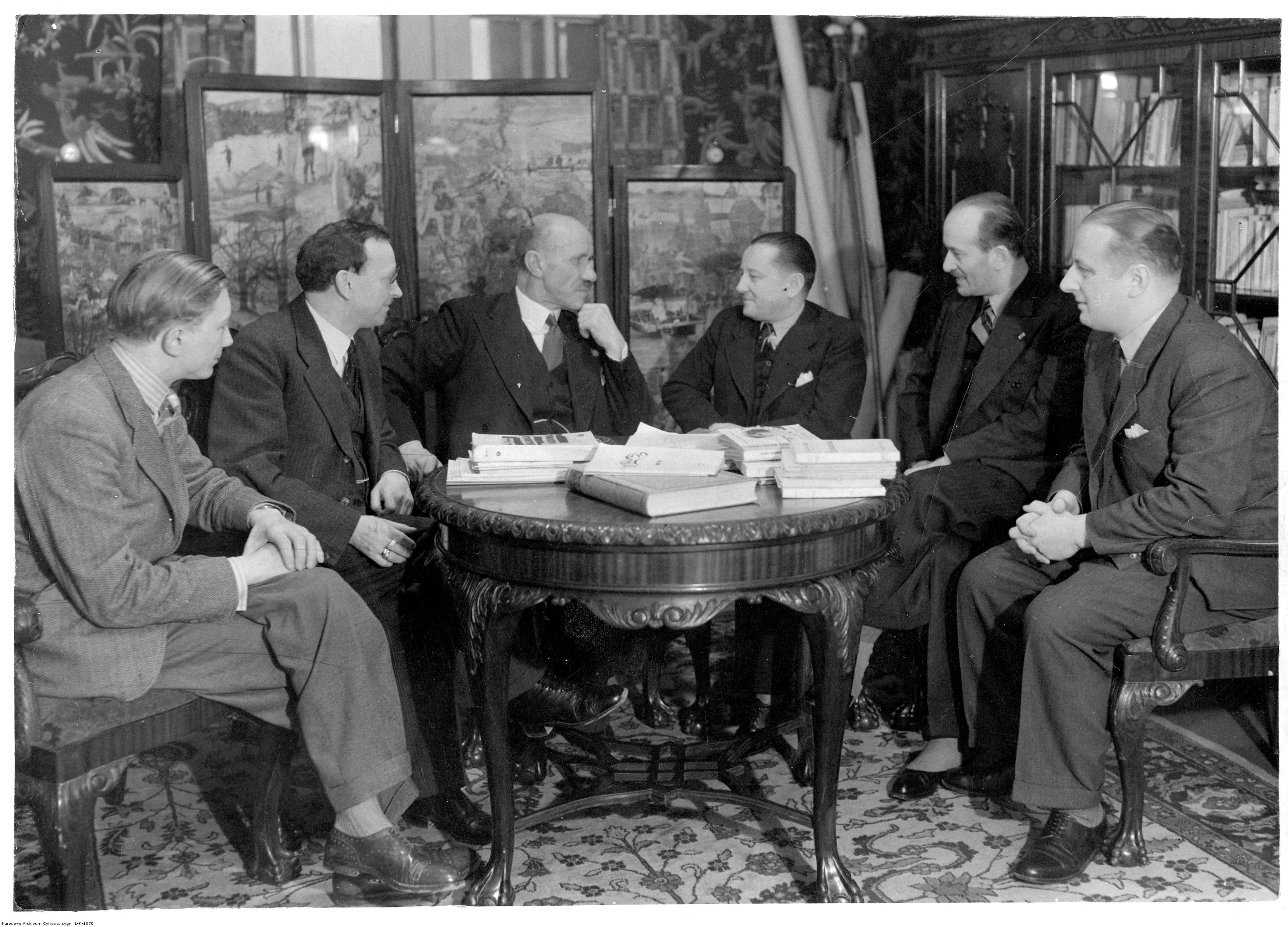 Kapitan MS "Batory" Eustazy Borkowski (trzeci z lewej) siedzi przy stoliku w towarzystwie: Klemensa Kęplicza (pierwszy z lewej), Jana Stankiewicza (drugi z l ewej), Wacława Szperbera (drugi z prawej), Antoniego Wasilewskiego (pierwszy z prawej), Kazimierza Dobiji (trzeci z prawej).