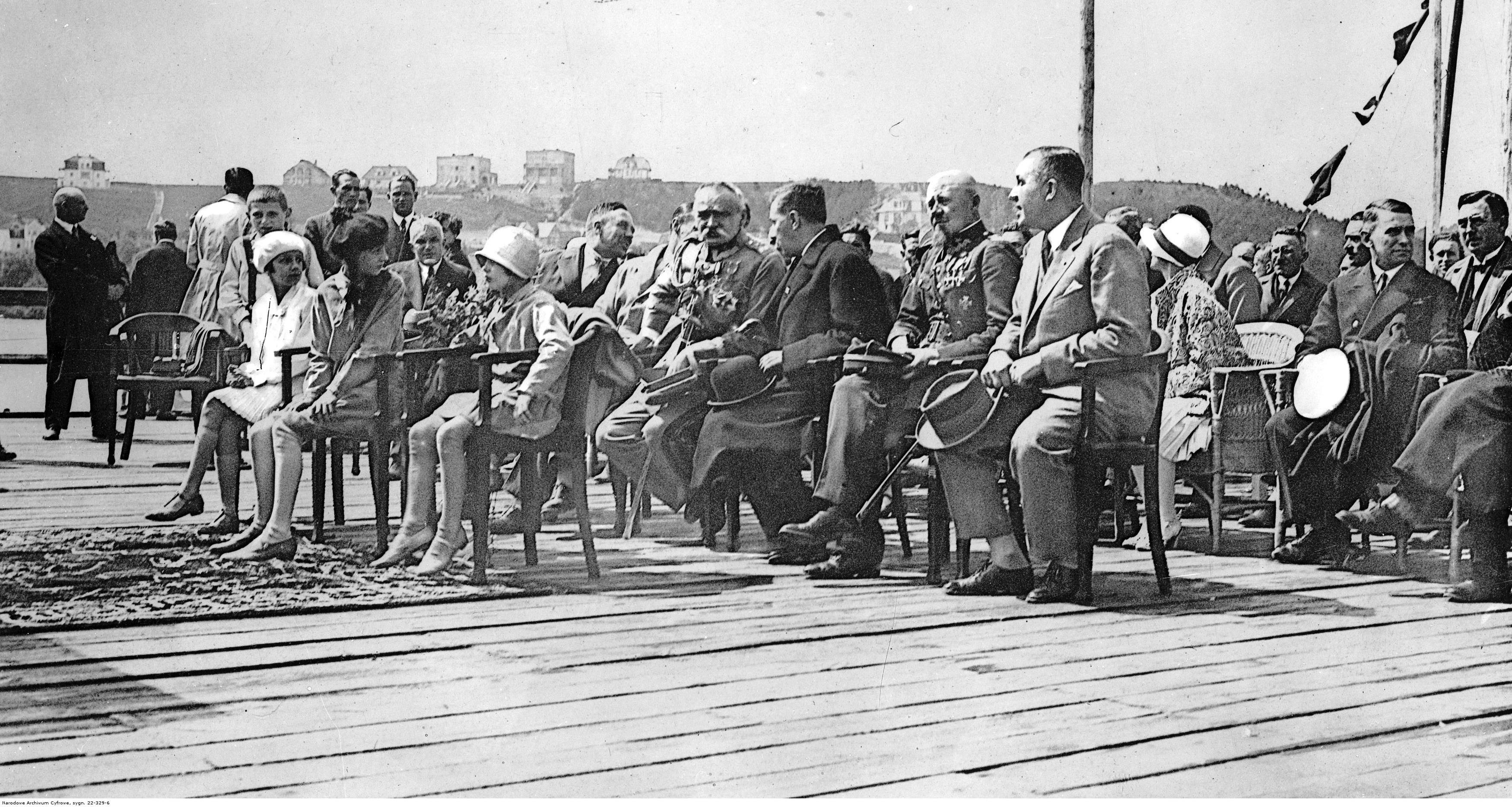 Molo drewniane "Żeglugi Polskiej" ze zgromadzonymi gośćmi przybyłymi z okazji uroczystości poświęcenia statków pasażerskich "Wanda", "Jadwiga", "Hanka". Wśród zaproszonych gości widoczni m.in.: marszałek Józef Piłsudski, jego córki Wanda (I rząd, w środku) i Jadwiga (I rząd 1. z prawej), minister przemysłu i handlu Eugeniusz Kwiatkowski (II rząd 3. z prawej), jeg córka Hanna Kwiatkowska (I rząd 1. z lewej), podpułkownik Aleksander Prystor (II rząd 2. z prawej), komisarz Rządu na m.st. Warszawę Władysław Jaroszewicz (II rząd 1. z prawej).