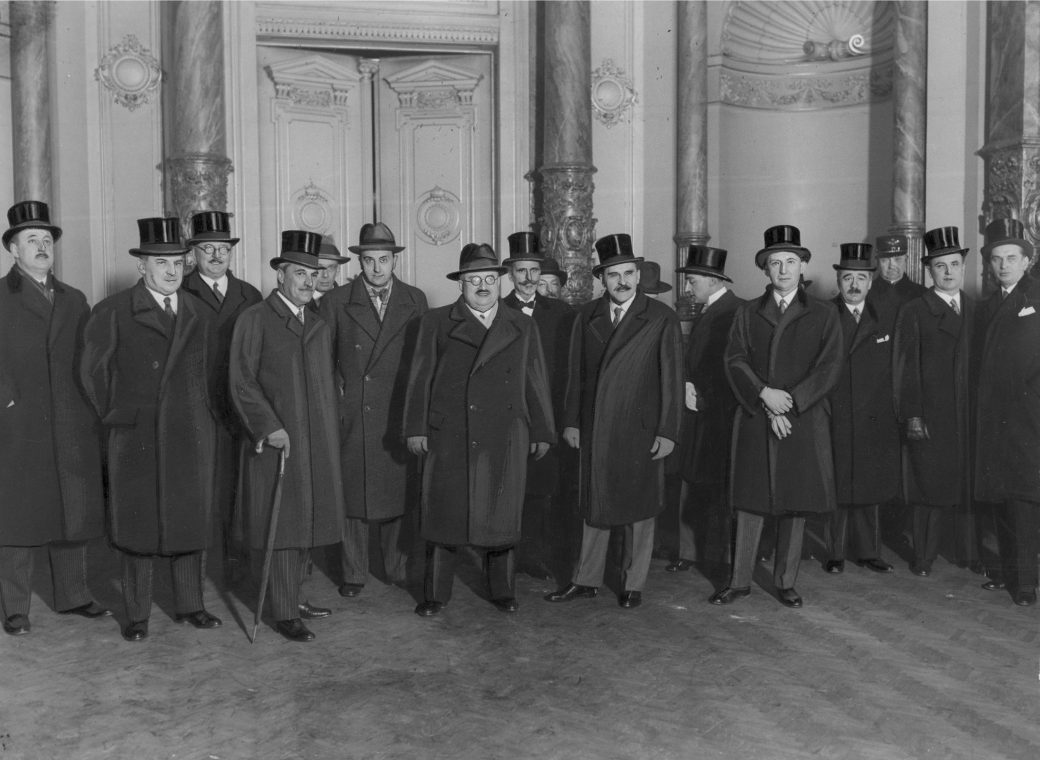 Stoją od lewej m.in.: konsul RP w Budapeszcie dr Zdzisław Chełmicki, Karol Mayer, senator hr. Somssich, prezes Wystawy Rolniczej prezes Kozłowski, dyrektor departamentu ministerstwa rolnictwa Adam Rose, minister rolnictwa Bronisław Nakoniecznikow-Klukowski, dyrektor węgierskiej izby rolniczej hr. Hoyos, minister rolnictwa Węgier Miklos Kallay, korespondent PAT Korsak, poseł RP w Budapeszcie Stanisław Łepkowski.