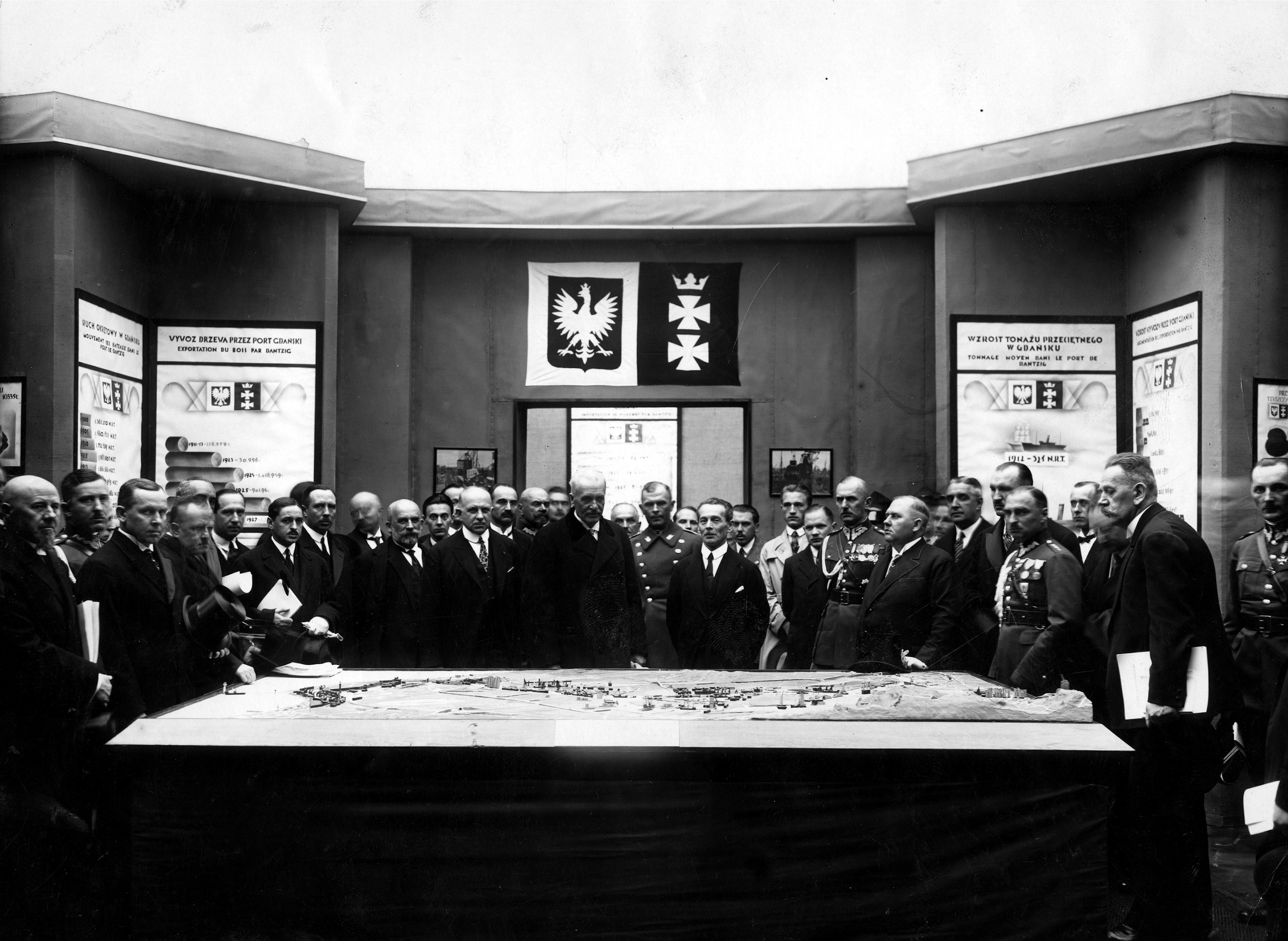 Prezydent RP Ignacy Mościcki (w środku pod godłem) w otoczeniu osób towarzyszących przed makietą portu gdańskiego. Widoczni m.in.: adiutanci prezydenta RP rtm. Wacław Calewski (na prawo za prezydentem) i kpt. Bolesław Suszyński (2. z prawej przy makiecie), minister Aleksander Prystor (1. z lewej), minister Ignacy Boerner (3. z lewej przy makiecie), minister reform rolnych Witold Staniewicz, prof. Karol Bertoni (na lewo od Mościckiego), płk Jan Głogowski (3. wojskowy z prawej), szef Administracji Armii gen. Daniel Konarzewski (na lewo za prezydentem), szef Kancelarii Cywilnej Prezydenta RP Adam Lisiewicz (na lewo za kpt. Bolesławem Suszyńskim).