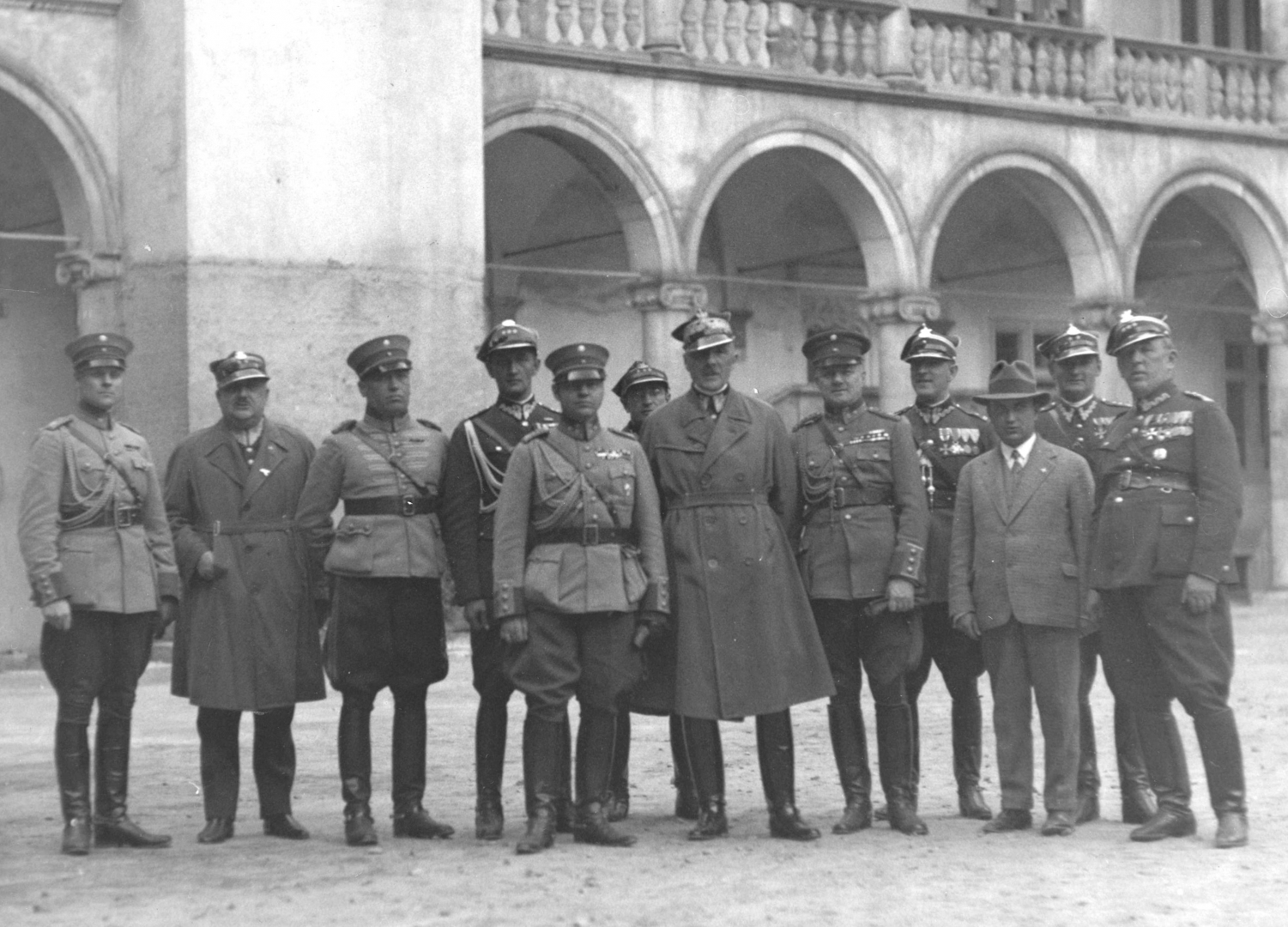 Fotografia grupowa fińskiej delegacji wojskowej oraz towarzyszących im polskich oficerów na Wawelu. Widoczni m.in.: gen. dyw. Stanisław Wróblewski (6. z prawej), płk Stanisław Bernard Mond (1. z prawej), płk Kurt Martti Wallenius (5. z lewej), płk Karl Birger Helsingius (5. z prawej).