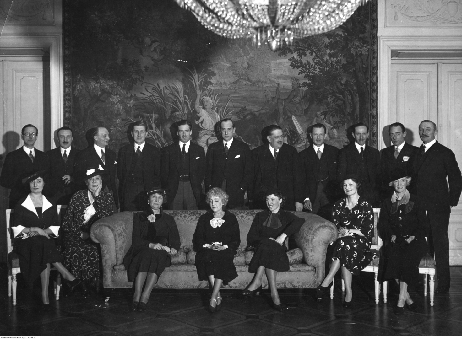 Śniadanie w Ambasadzie Wielkiej Brytanii. Stoją od lewej: William Strang, Roman Dębicki, dyrektor Karol Romer, hrabia Potocki, minister Anthony Eden, minister Józef Beck, wiceminister Jan Szembek, ambasador Edward Raczyński, sekretarz Aveling. Siedzą od lewej: Olga Romer, hrabina Sobańska, księżna Czetwertyńska, NN, Jadwiga Beck, pani Dębicka.