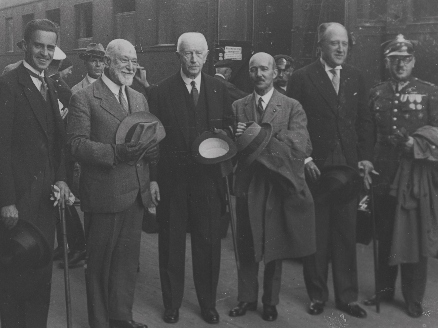Polscy kawalerowie maltańscy w towarzystwie przybyłych gości na peronie dworca kolejowego. Stoją od lewej: Stanisław Milewski-Lipkowski, wielki mistrz Ludovico Chigi Albani della Rovere, Bogdan Hutten-Czapski, marszałek dworu baron Oskar Vesque-Püttlingen, zastępca szefa Protokołu Dyplomatycznego Rajnold Przeździecki, ppłk Zbigniew Belina-Prażmowski. Fotografię wykonał Leon Jarumski.
