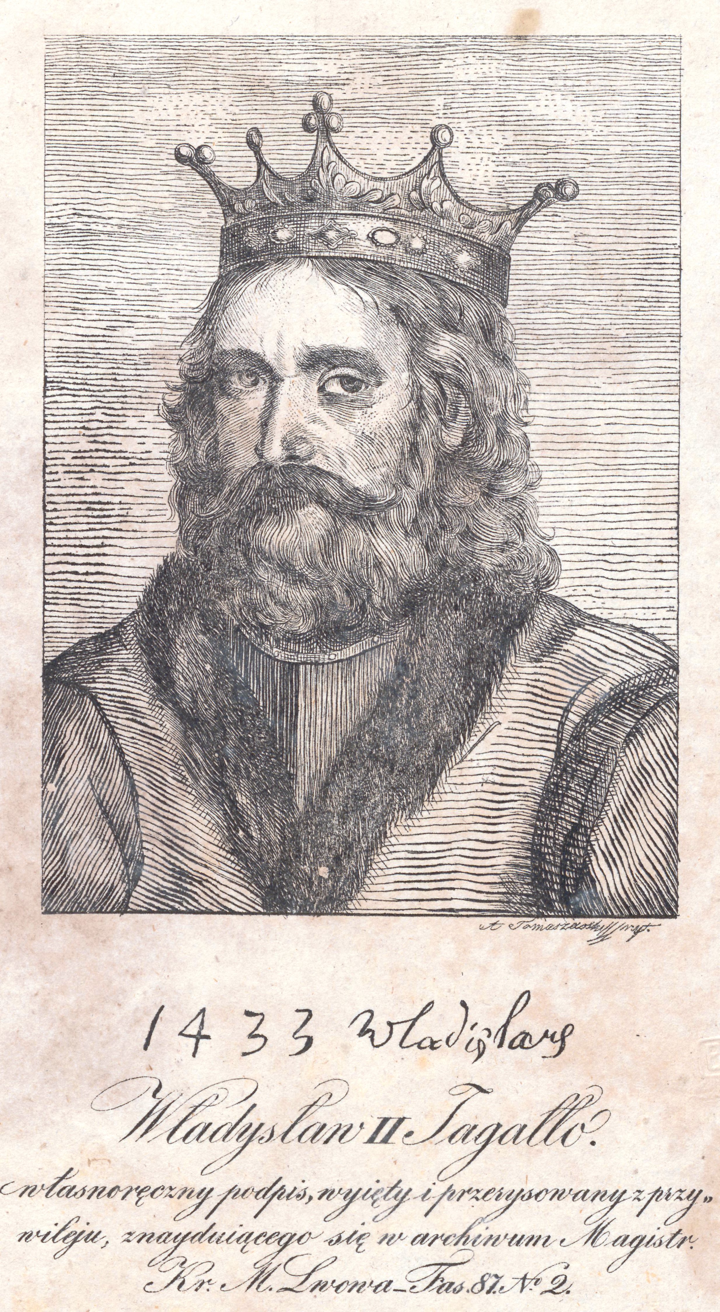 , "Władysław II Jagiełło, własnoręczny podpis, wyiety i przerysowany z przywileju, znaydującego się w archiwum Magistr. Kr. M. Lwowa - Fas. 87. No. 2" Alojzego Tomaszewskiego. ., [w:] Polski słownik biograficzny, t. ,