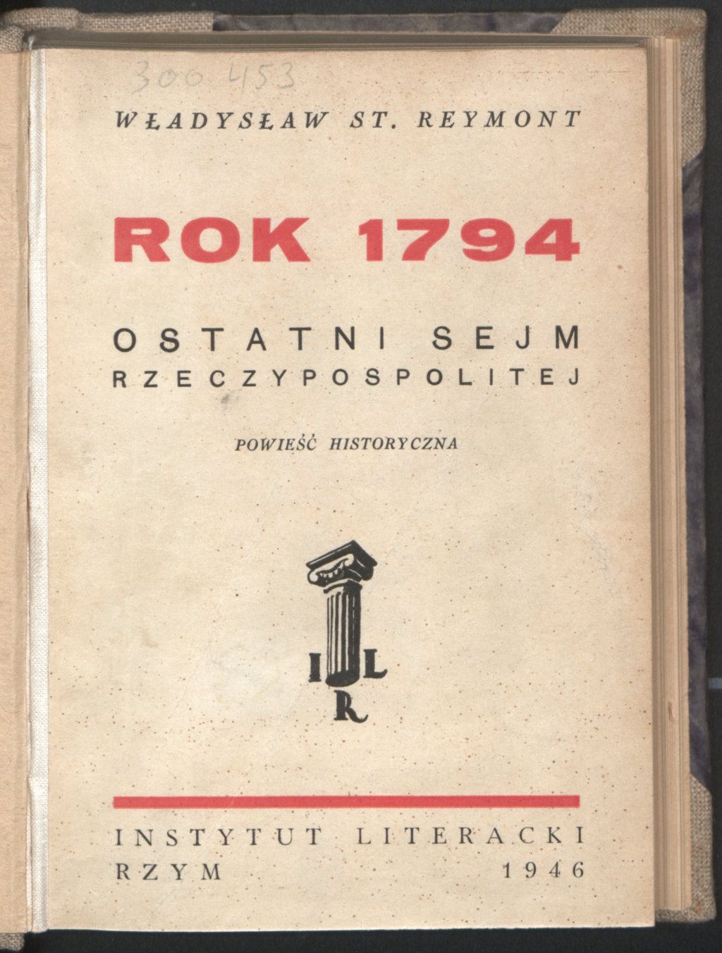 Władysław Stanisław Reymont "Rok 1794 : powieść historyczna. [T. 1], Ostatni Sejm Rzeczypospolitej" (strona tytułowa), [online] Warszawa: Narodowy Instytut Audiowizualny [dostęp 15.04.2026]. Dostępny w internecie: http://www.ipsb.nina.gov.pl/a/foto/wladyslaw-stanislaw-reymont-rok-1794-powiesc-historyczna-t-1-ostatni-sejm-rzeczypospolitej-strona-tytulowa