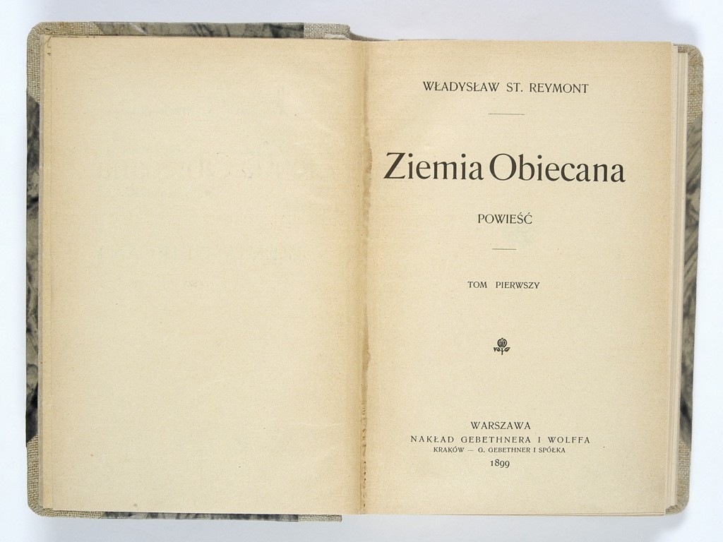 Władysław Stanisław Reymont "Ziemia obiecana: powieść. T. 1" (strona tytułowa), [online] Warszawa: Narodowy Instytut Audiowizualny [dostęp 15.04.2026]. Dostępny w internecie: http://www.ipsb.nina.gov.pl/a/foto/wladyslaw-stanislaw-reymont-ziemia-obiecana-powiesc-t-1-strona-tytulowa