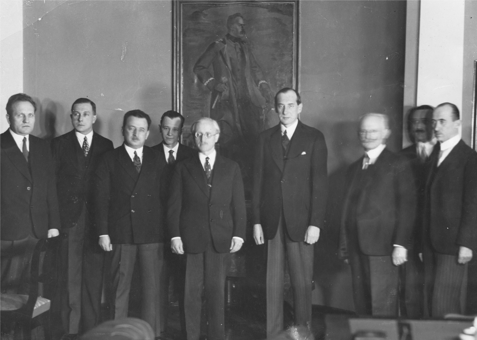 Widoczni od lewej: przedstawiciel handlowy ZSRR Abel, pierwszy sekretarz Poselstwa ZSRR w Polsce Nikołajew, radca Poselstwa ZSRR w Polsce Bohdan Podolski, poseł nadzwyczajny i minister pełnomocny Władimir Antonow Owsiejenko (5.), minister spraw zagranicznych Józef Beck, poseł nadzwyczajny i minister pełnomocny Stanisław Patek, sekretarz Ministerstwa Spraw Zagranicznych Roman Dębicki, dyrektor Departamentu Polityczno-Ekonomicznego MSZ Tadeusz Schaetzel. W tle widoczny portret marszałka Józefa Piłsudskiego.