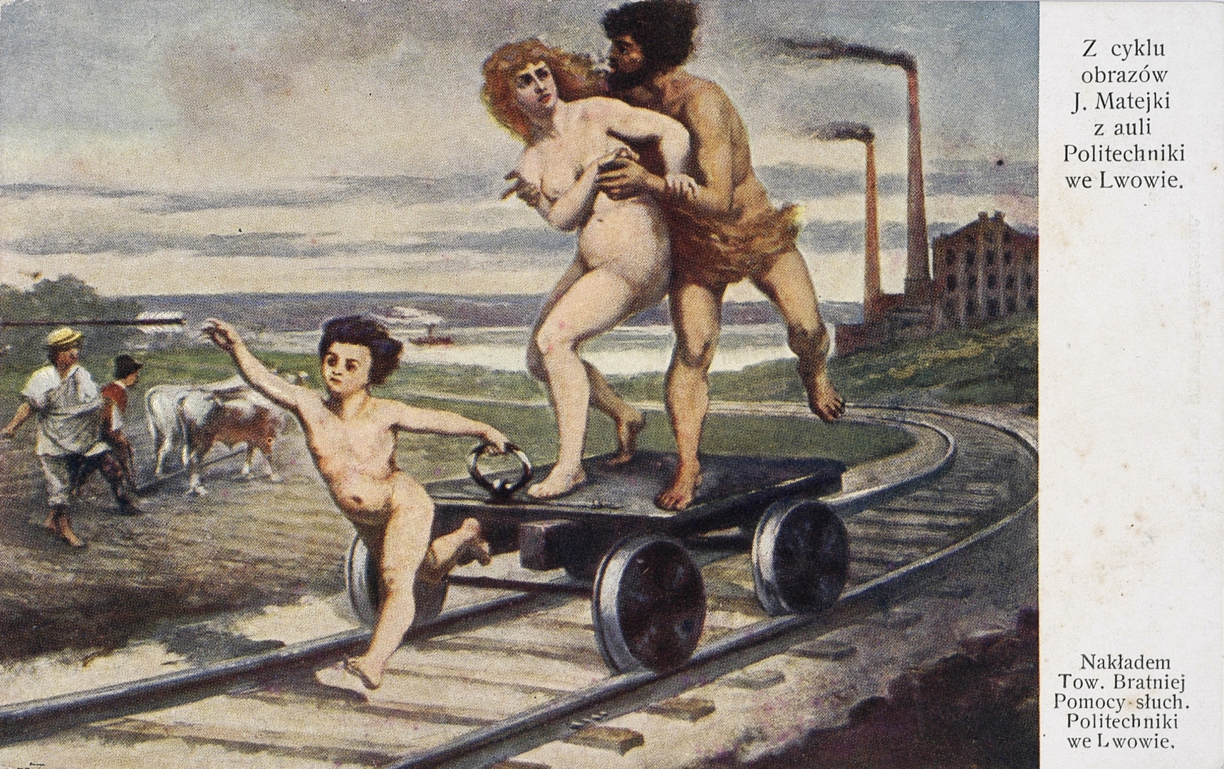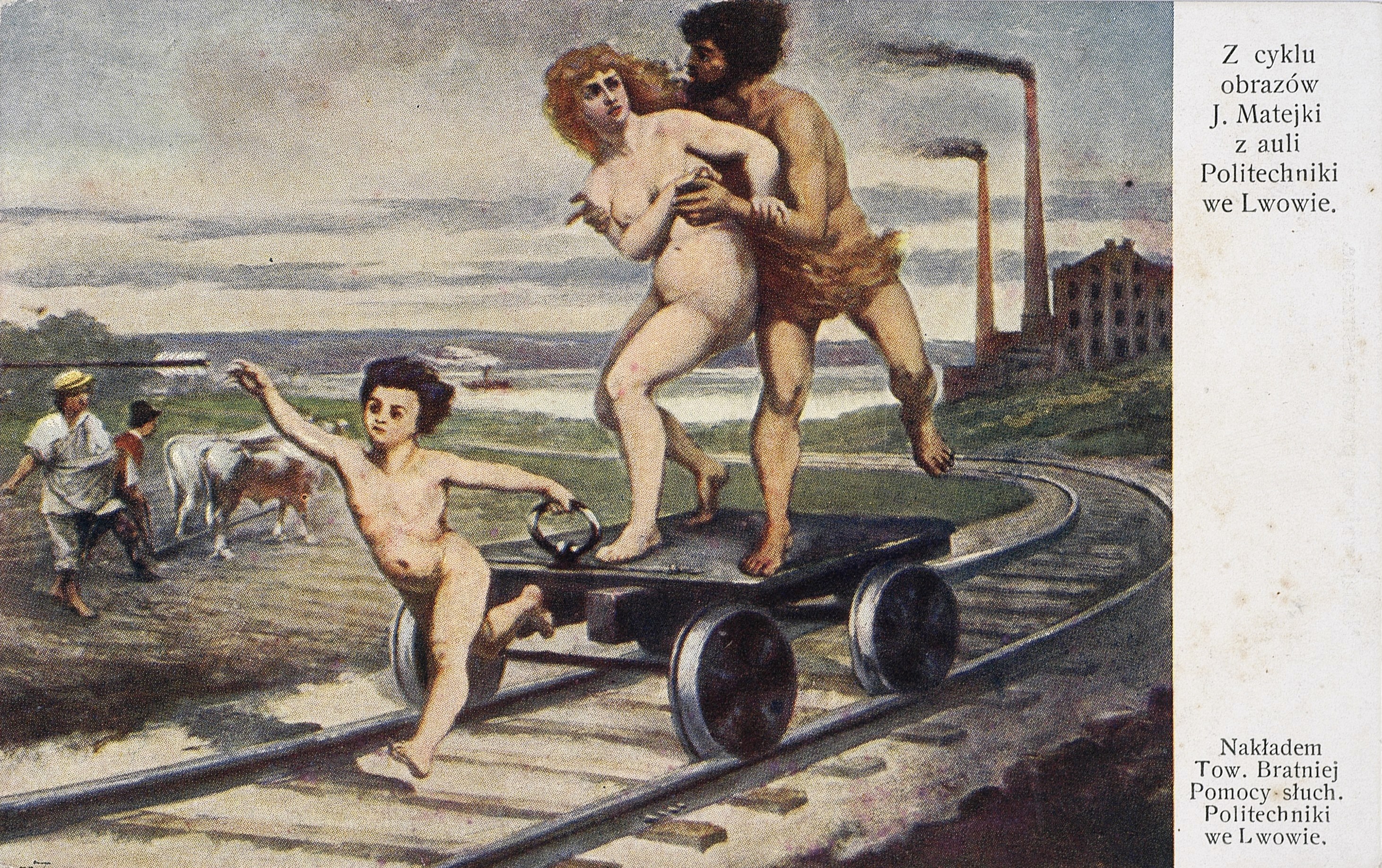Pocztówka z około 1910 roku z obrazem z cyklu ukazującego postęp cywilizacji zdobiącego aulę Politechniki we Lwowie. Cykl ten, złożony z 11 obrazów, powstał według programu ideowego i szkiców Jana Matejki wykonanych w latach 1883-1885. Namalowali go jego uczniowie i wykładowcy Krakowskiej Szkoły Sztuk Pięknych. Obrazy zamontowano w auli w 1892 roku.