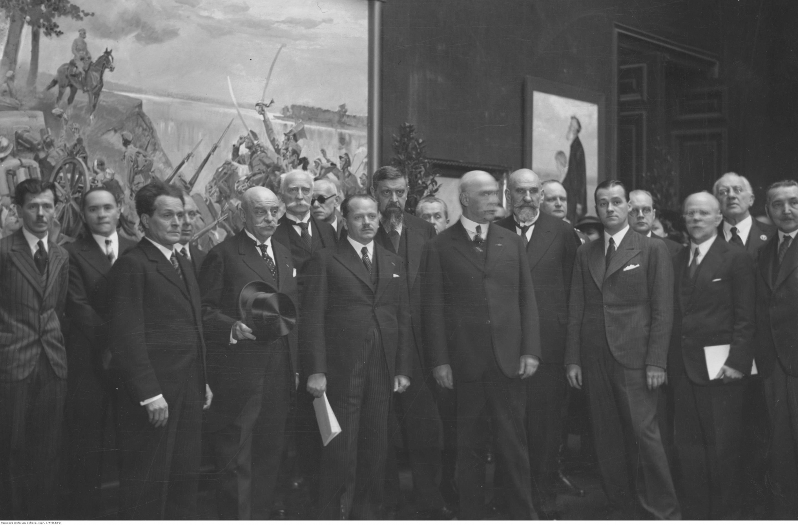 Uczestnicy uroczystego otwarcia wystawy. Widoczni m.in.: prezes Zachęty Stanisław Brzeziński (z cylindrem w dłoni), wiceprezes Zachęty malarz Stanisław Zawadzki (3. z lewej), premier Marian Kościałkowski (pierwszy rząd 3. z lewej), wiceminister wyznań religijnych i oświecenia publicznego Konstanty Chyliiński (brunet z brodą), artysta malarz Kazimierz Lasocki (łysy z brodą), artysta malarz Wojciech Kossak (nieostra twarz).