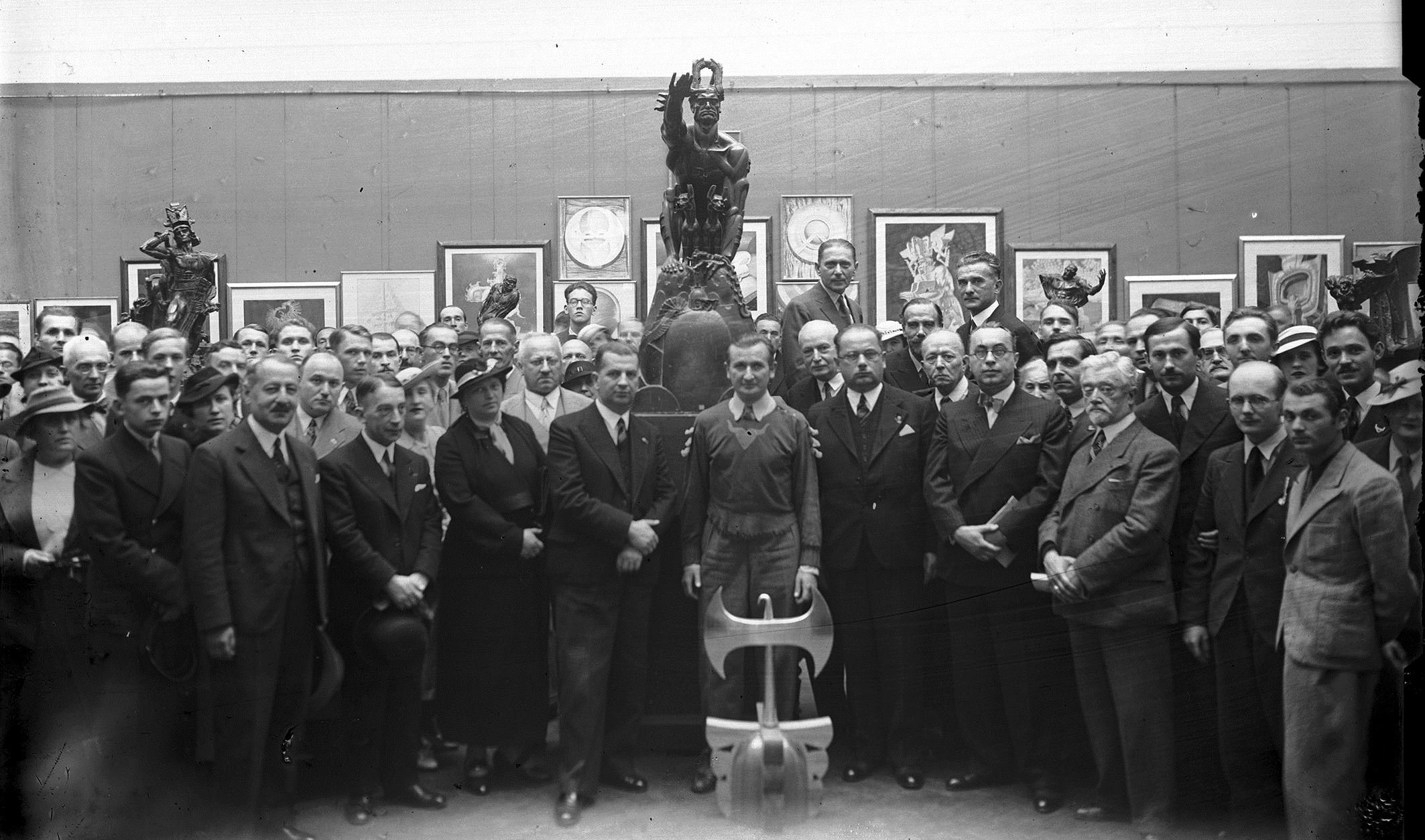 Uczestnicy otwarcia wystawy. Widoczni m.in. w pierwszym rzędzie od lewej: dyrektor Okręgu Poczt i Telegrafów w Karkowie Alfred Spett, dr Stankowski, wicewojewoda krakowski Piotr Małaszyński, artysta malarz i rzeźbiarz Stanisław Szukalski, wiceprezydent Krakowa Rudolf Radzyński, prof. Franciszek Walter, artysta malarz Wincenty Wodzinowski, sekretarz Towarzystwa Przyjaciół Sztuk Pięknych Karol Kramarczyk (najwyższa postać z tyłu).
