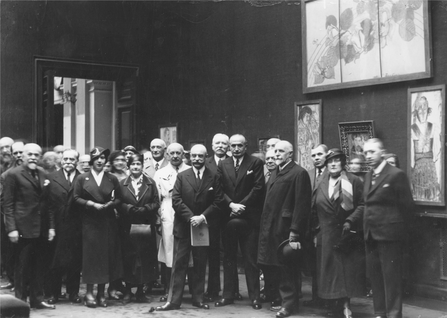 Uczestnicy otwarcia wystawy. Widoczni m.in. prezes Towarzystwa Zachęty Sztuk Pięknych Stanisław Brzeziński (w środku z wšsami, trzyma książkę), pisarz Kornel Makuszyński (w środku, w jasnym płaszczu), poseł nadzwyczajny i minister pełnomocny Jugosławii w Polsce Branko Lazarević (I rząd 4. z prawej).