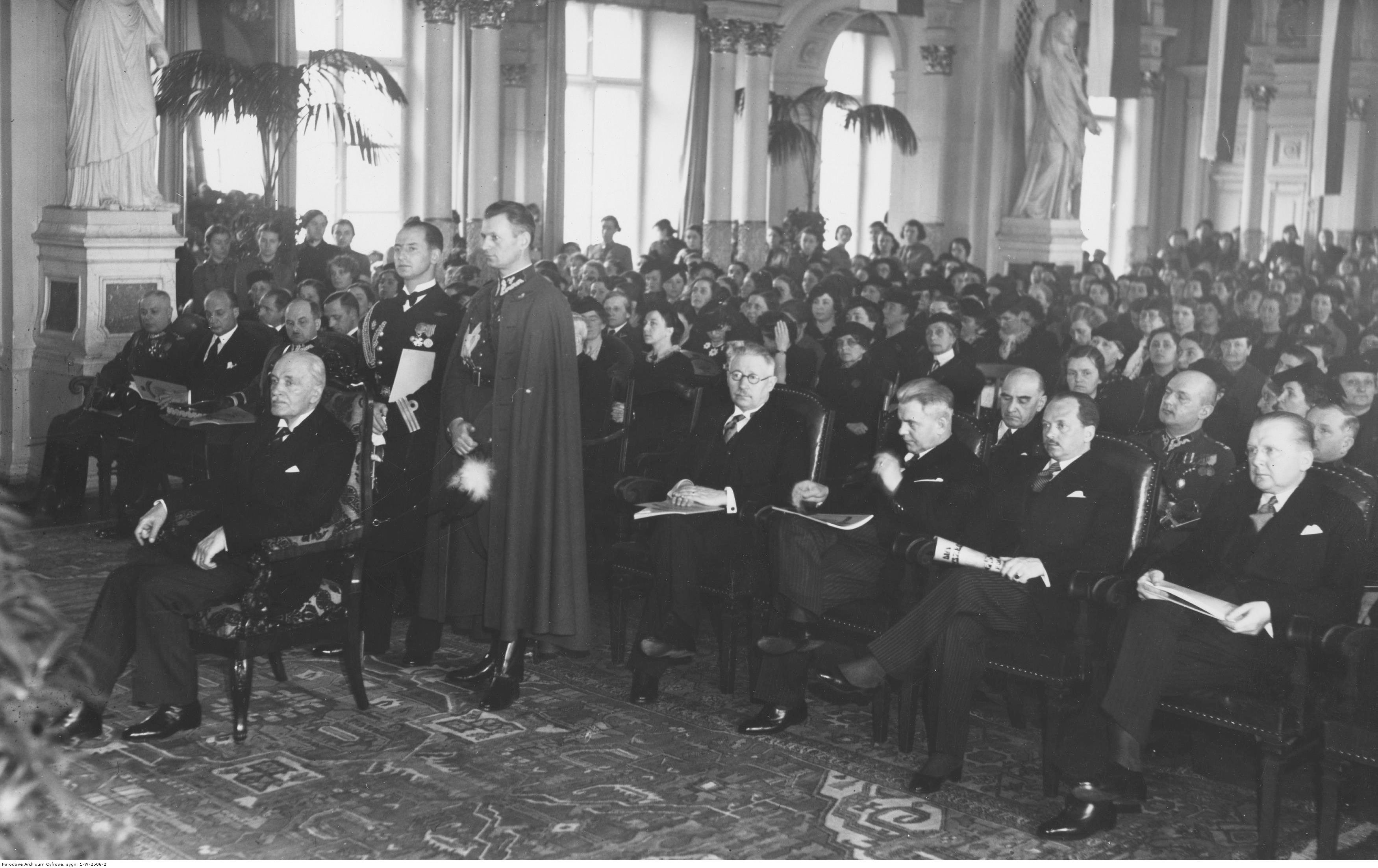 Widok na salę Rady Miejskiej i uczestników obrad. Z przodu widoczny Prezydent RP Ignacy Mościcki, za nim jego adiutanci kpt. Strzelców Podhalańskich Józef Hartman i kapitan Marynarki Wojennej RP Stefan Kryński. Z prawej w pierwszym rzędzie widoczni: minister poczt i telegrafów Emil Kaliński, minister opieki społecznej Marian Zyndram Kościałkowski, minister komunikacji Juliusz Ulrych, minister wyznań religijnych i oświecenia publicznego Wojciech Świętosławski.