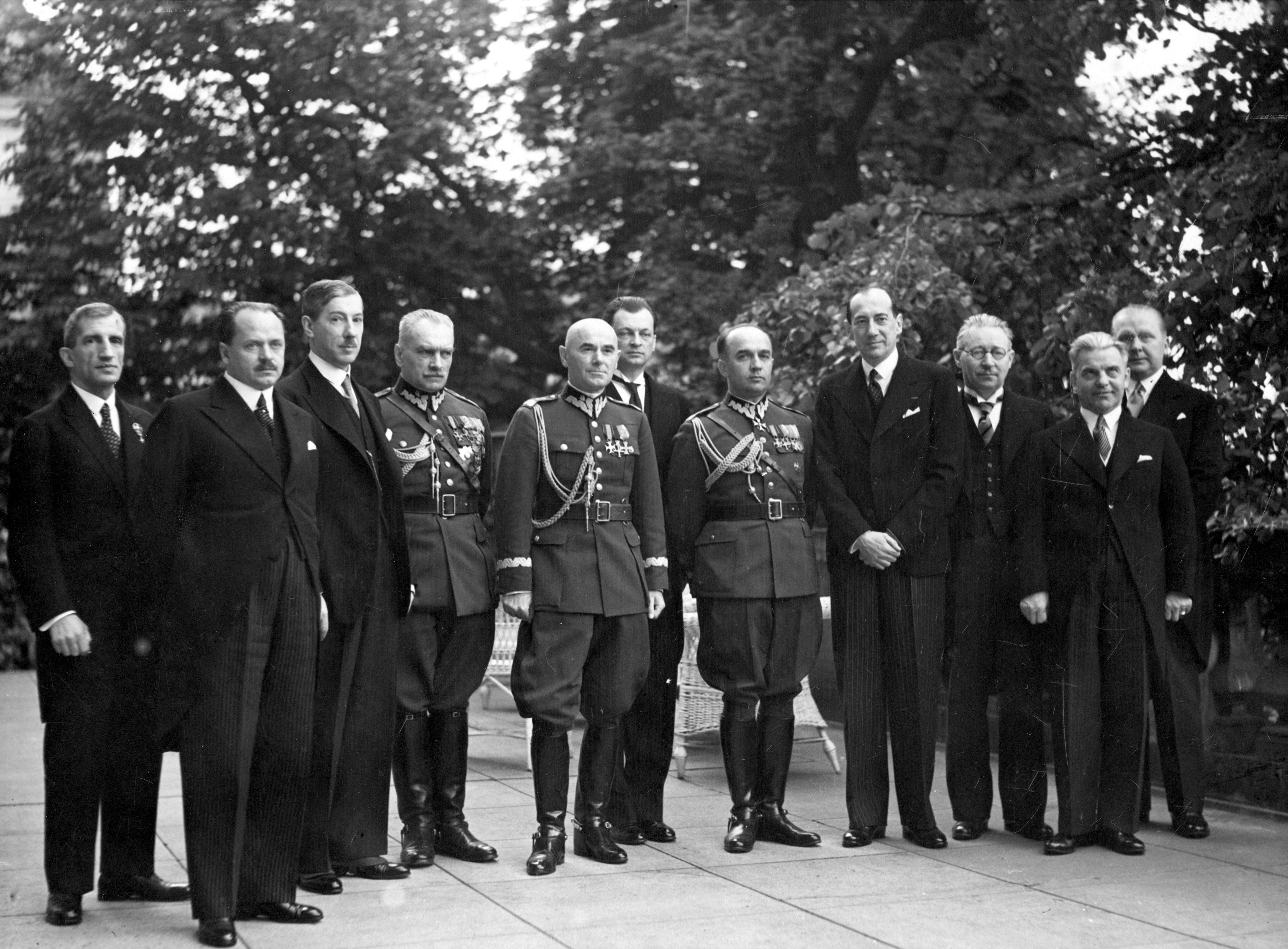 Członkowie gabinetu. Stoją od lewej: minister rolnictwa i reform rolnych Juliusz Poniatowski, minister opieki społecznej Marian Zyndram Kościałkowski, wicepremier Eugeniusz Kwiatkowski, premier Felicjan Sławoj Składkowski, marszałek Edward Rydz-Śmigły, minister sprawiedliwości Witold Grabowski, minister spraw wojskowych generał Tadeusz Kasprzycki, minister spraw zagranicznych Józef Beck, minister wyznań religijnych i oświecenia publicznego Wojciech Świętosławski, minister komunikacji Juliusz Ulrych, minister poczt i telegrafów Emil Kaliński.