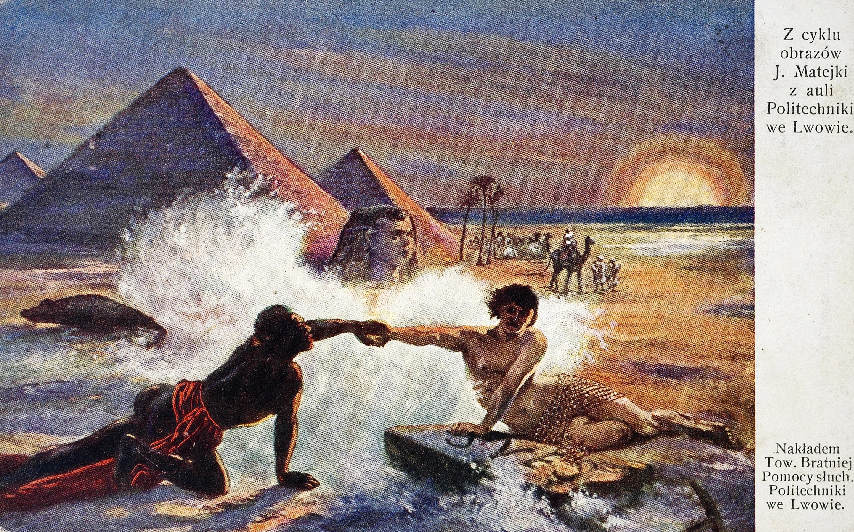 Pocztówka wydana około 1910 roku z obrazem z cyklu ukazującego postęp cywilizacji zdobiącego aulę Politechniki we Lwowie. Cykl ten, złożony z 11 obrazów, powstał według programu ideowego i szkiców Jana Matejki wykonanych w latach 1883-1885. Namalowali go jego uczniowie i wykładowcy Krakowskiej Szkoły Sztuk Pięknych. Obrazy zamontowano w auli w 1892 roku.