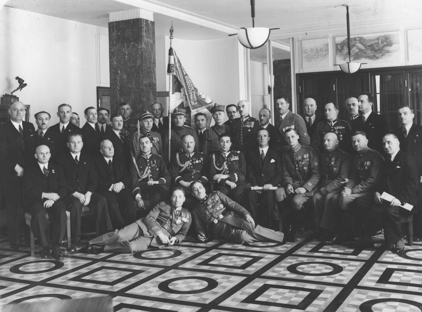 Fotografia grupowa uczestników zebrania. Leżą: por. M. Szmigiero i prezes okręgu warszawskiego Stowarzyczenia por. N. Wentowski. Siedza od lewej: prezes chorzowskiego oddziału Stowarzyszenia W. Simiński, prezes okręgu śląskiego Stowarzyszenia T. Mańczyk, wiceprezes Zarządu Głównego Stowarzyszenia ppłk St. Skórski, gen. Kazmierz Schally, gen. Jerzy Wołkowicki, prezes Zarządu Głównego Stowarzyszenia gen. E. Piekarski, dr. A. Znamięcki, sekretarz generalny Stowarzyszenia mjr W. Giżycki, wiceprezes okręgu poznańskiego Stowarzyszenia L. Radaczyński, prezes równieńskiego oddziału Stowarzyszenia por. F. Wójcik i ppłk A. Borenstaedt. Stoją: skarbnik Stowarzyszenia W. Dominiak, prezes okręgu krakowskiego Stowarzyszenia M. Królikiewicz, Kempka, Siedlecki, Raszke, Więch, skarbnik okręgu warszawskiego Stowarzyszenia R. Syropolski, prezes okręgu lwowskiego Stowarzyszenia kpt. F. Ochman, chorąży okręgu warszawskiego Stowarzyszenia Ziółkowski, Skwarek, Kowalewski, redaktor J. Kamiński, ppłk. G. Testardt-Obalski, prezes łódzkiego oddziału Stowarzyszenia Z. Gutner, prezes wołyńskiego okręgu Stowarzyszenia A. Miliński, prezes okręgu pomorskiego Stowarzyszenia kpt. Zieliński, ppłk Adam Skałkowski, mjr St. Łoziński i przewodniczący komisji odznaczeniowej Stowarzyszenia kpt. T. Matuszewski.