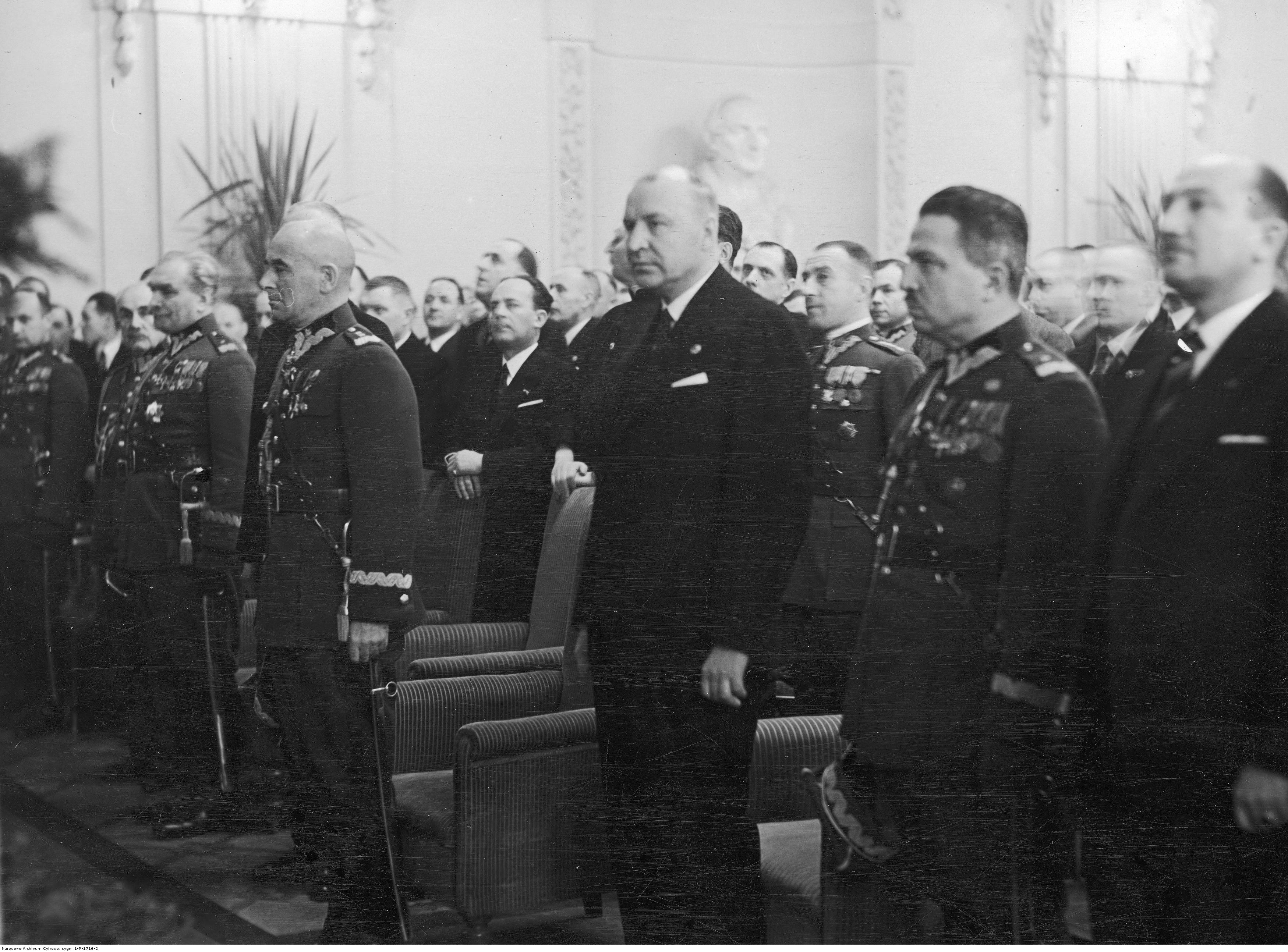 Widok sali w czasie zjazdu. W pierwszym rzędzie stoją od prawej: wiceprezydent Warszawy Józef Ołpiński, generał Czesław Jarnuszkiewicz, marszałek sejmu Stanisław Car, generalny inspektor sił zbrojnych generał Edward Rydz-Śmigły (wysunięty z fotelem do przodu), wiceminister spraw wojskowych Felicjan Sławoj-Składkowaki, generał Kajetan Olszewski, generał Józef Olszyna-Wilczyński.