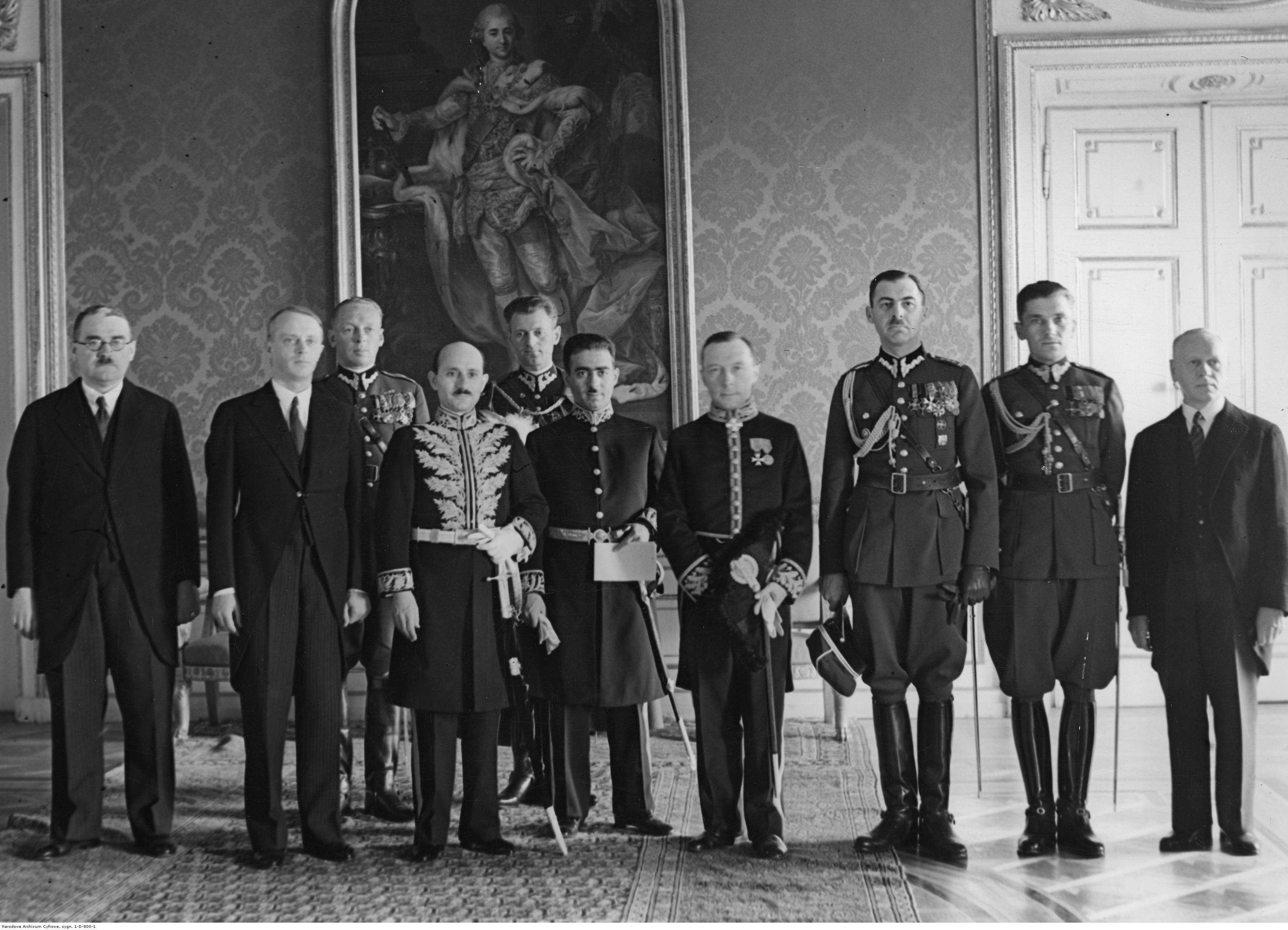 Poseł nadzwyczajny i minister pełnomocny Iranu w Polsce Mirza Schayesteh (czwarty z lewej) w towarzystwie: zastępcy szefa Kancelarii Cywilnej Prezydenta RP Zygmunta Skowrońskiego (pierwszy z lewej), szefa Kancelarii Cywilnej Prezydenta RP Stanisława Świeżawskiego (drugi z lewej), mjr. Zygmunta Gużewskiego (trzeci z lewej), kpt. Józefa Hartmana (piąty z lewej), kierownika Referatu Orderowego MSZ Pawła Morstina (czwarty z prawej), szefa Gabinetu Wojskowego Prezydenta RP, gen. Kazimierza Schally (trzeci z prawej), zastępcy szefa Gabinetu Wojskowego Prezydenta RP mjr. Władysława Krawczyka (drugi z prawej) i kierownika Referatu Orderowego Kancelarii Cywilnej Prezydenta RP Henryka Zaniewskiego (pierwszy z prawej), po złożeniu listów uwierzytelniających prezydentowi RP Ignacemu Mościckiemu.