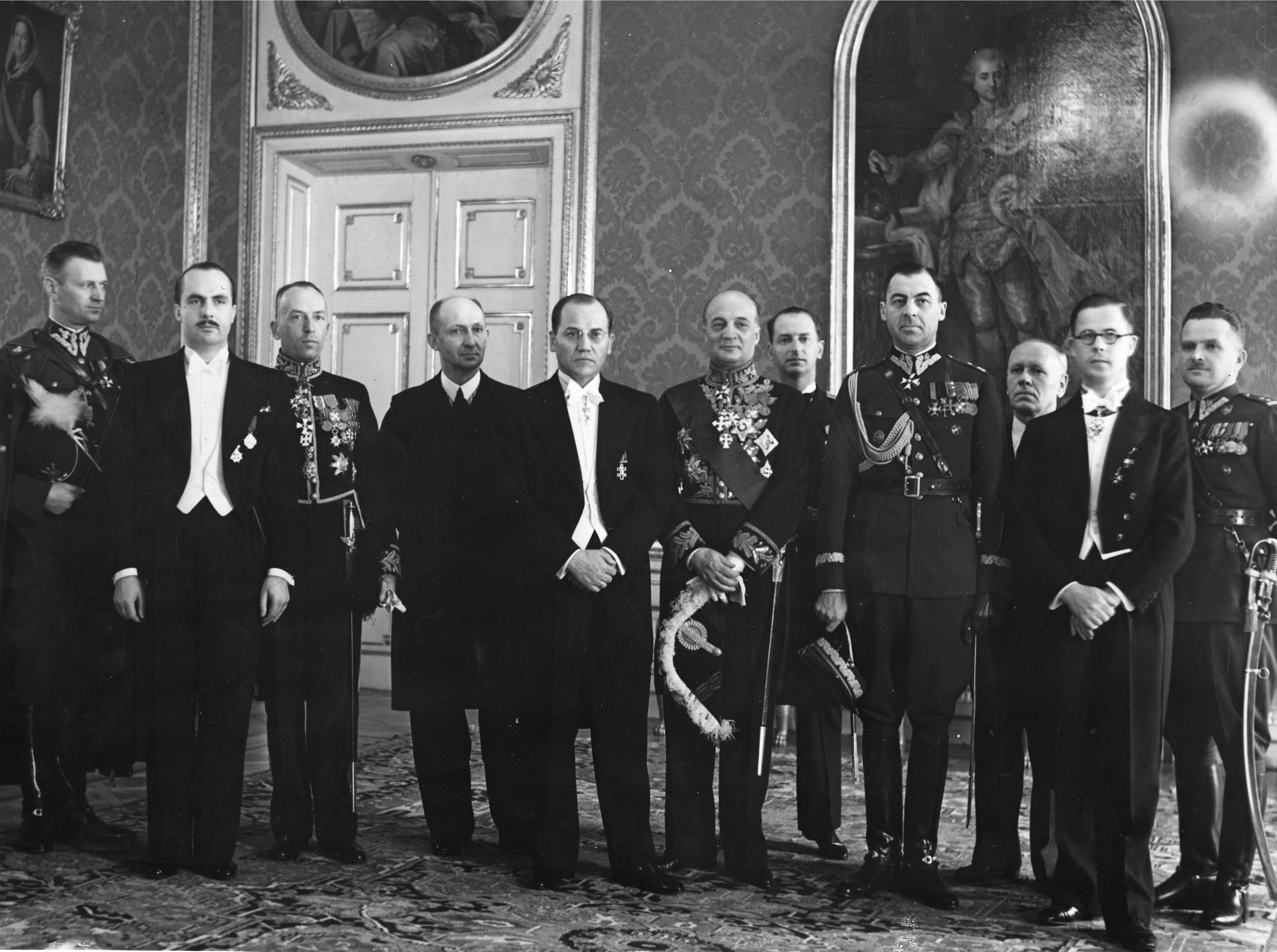 Poseł nadzwyczajny i minister pełnomocny Litwy w Polsce Kazys Skirpa (5. z lewej) w towarzystwie: radcy poselstwa Antoniego Primakisa (2. z prawej), sekretarza poselstwa Jurgisa Kairiuksztisa, szefa Protokołu Dyplomatycznego MSZ Karola Romera (6. z lewej), zastępcy szefa Protokołu Dyplomatycznego MSZ Aleksandra łubieńskiego (3. z lewej), szefa Gabinetu Wojskowego Prezydenta RP ppłk. Stefana Czerwińskiego (1. z lewej), szefa Kancelarii Cywilnej Prezydenta RP Stanisława Łepkowskiego (4. z lewej), kierownika Referatu Ogólnego Kancelarii Cywilnej Prezydenta RP Henryka Zaniewskiego (3. z prawej) oraz adiutantów prezydenta: kpt. Jozefa Hartmana (1. z lewej) i kpt. Stefana Kryńskiego (5. z prawej).