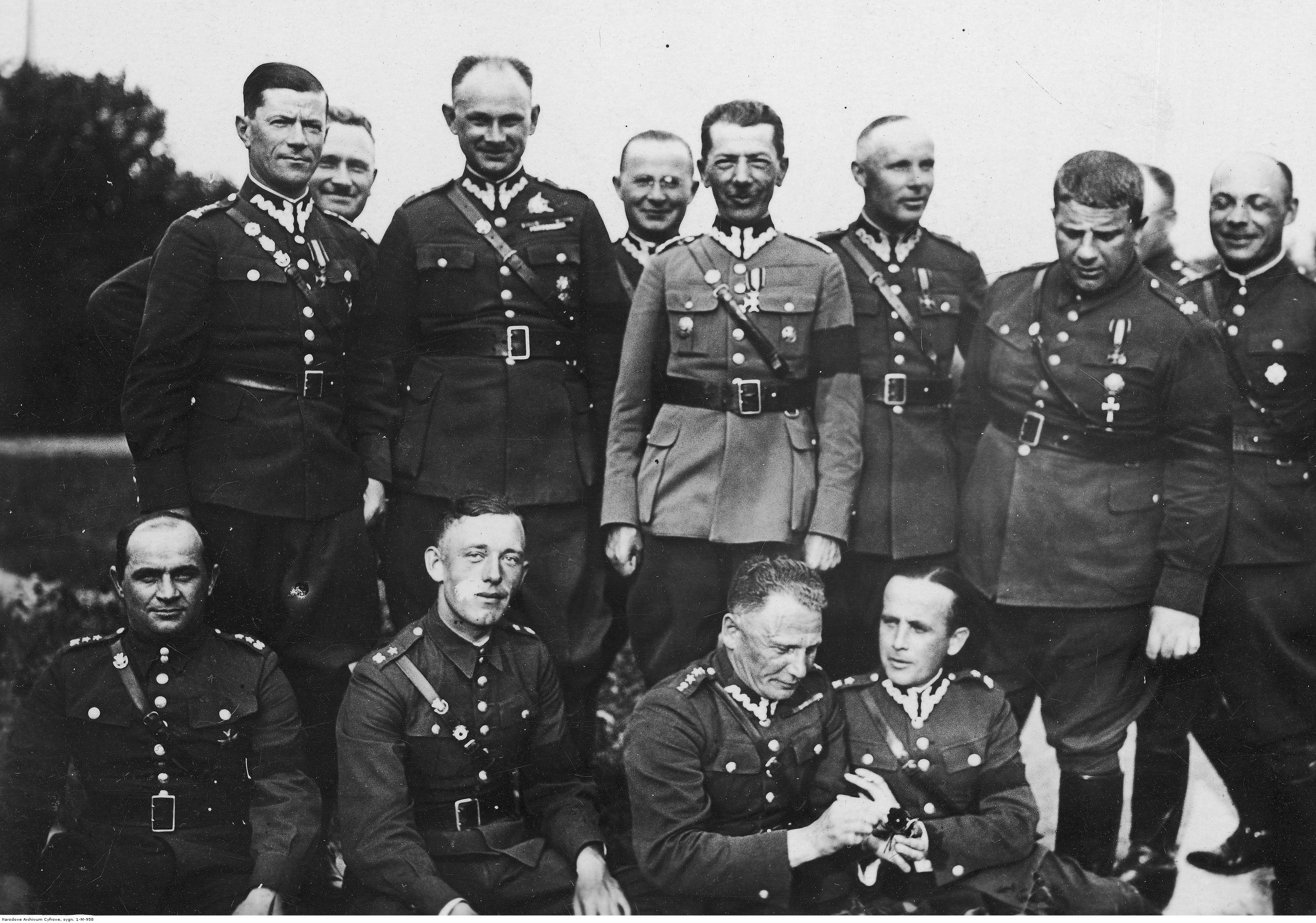 Kapitan Franciszek Hynek (siedzi 2. z prawej) i porucznik Władysław Pomaski (stoi 3. z lewej) w grupie żołnierzy. Widoczni m.in.: pułkownik Mikołaj Bołtuć (stoi 1. z lewej), pułkownik Józef Wiatr, major Ignacy Pilwiński, podporucznik rezerwy Mieczysław Dachowski (rozmawia z F. Hynkiem), major Stanisław Piro.
